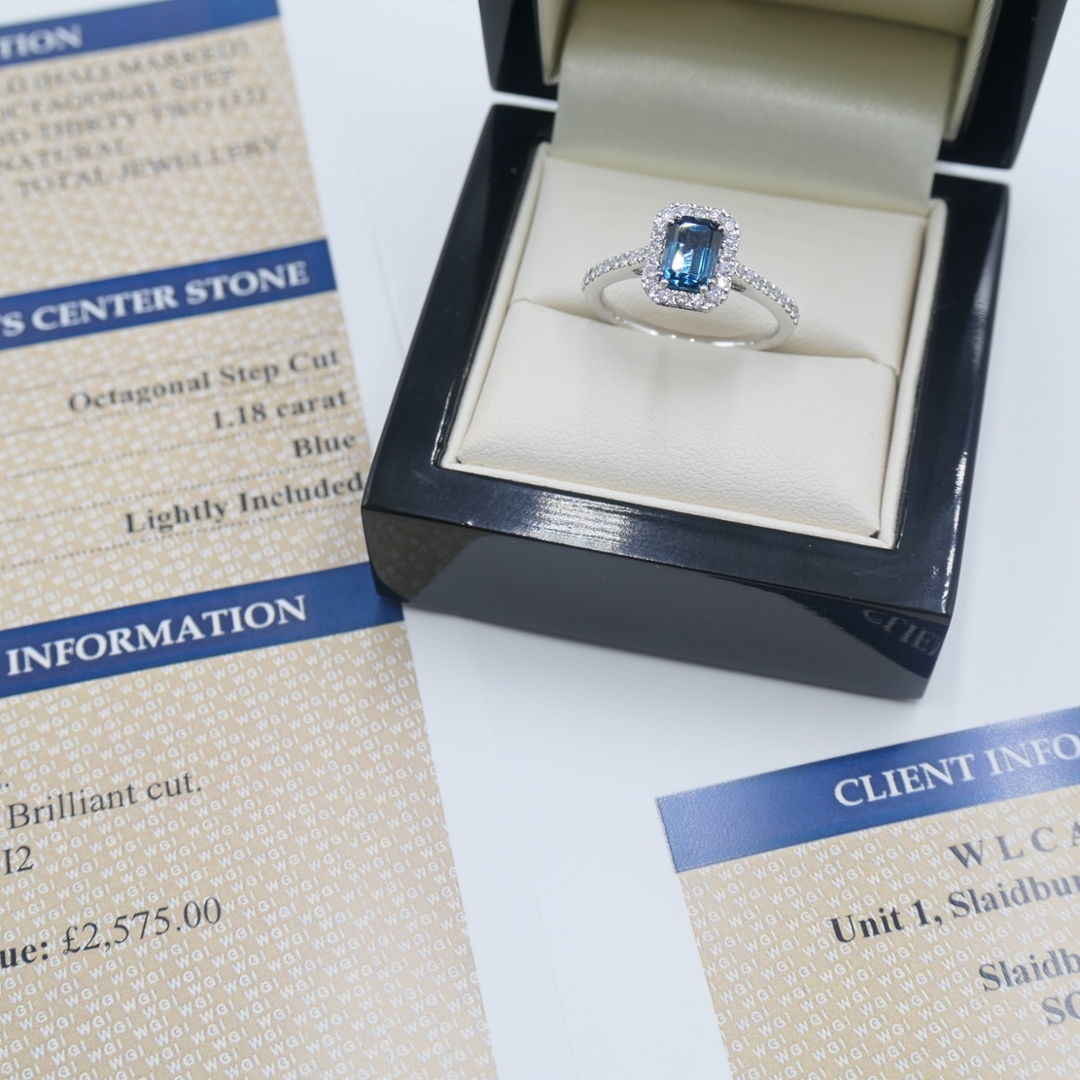A brand-new, unused ring crafted in 18ct white gold, this certified cluster design showcases a 1.18ct octagonal step-cut natural blue topaz at its centre. Its rich blue tone is elegantly framed by a halo of brilliant-cut natural diamonds, with further diamonds set along the shoulders for added radiance and refinement. Together, the gemstones create a balanced composition of bold colour and sparkling brilliance, while the cool lustre of white gold enhances their vibrancy. The diamonds, totalling 0.39ct, are graded F–G in colour with SI1–SI2 clarity, ensuring they display excellent light performance and eye-catching fire.