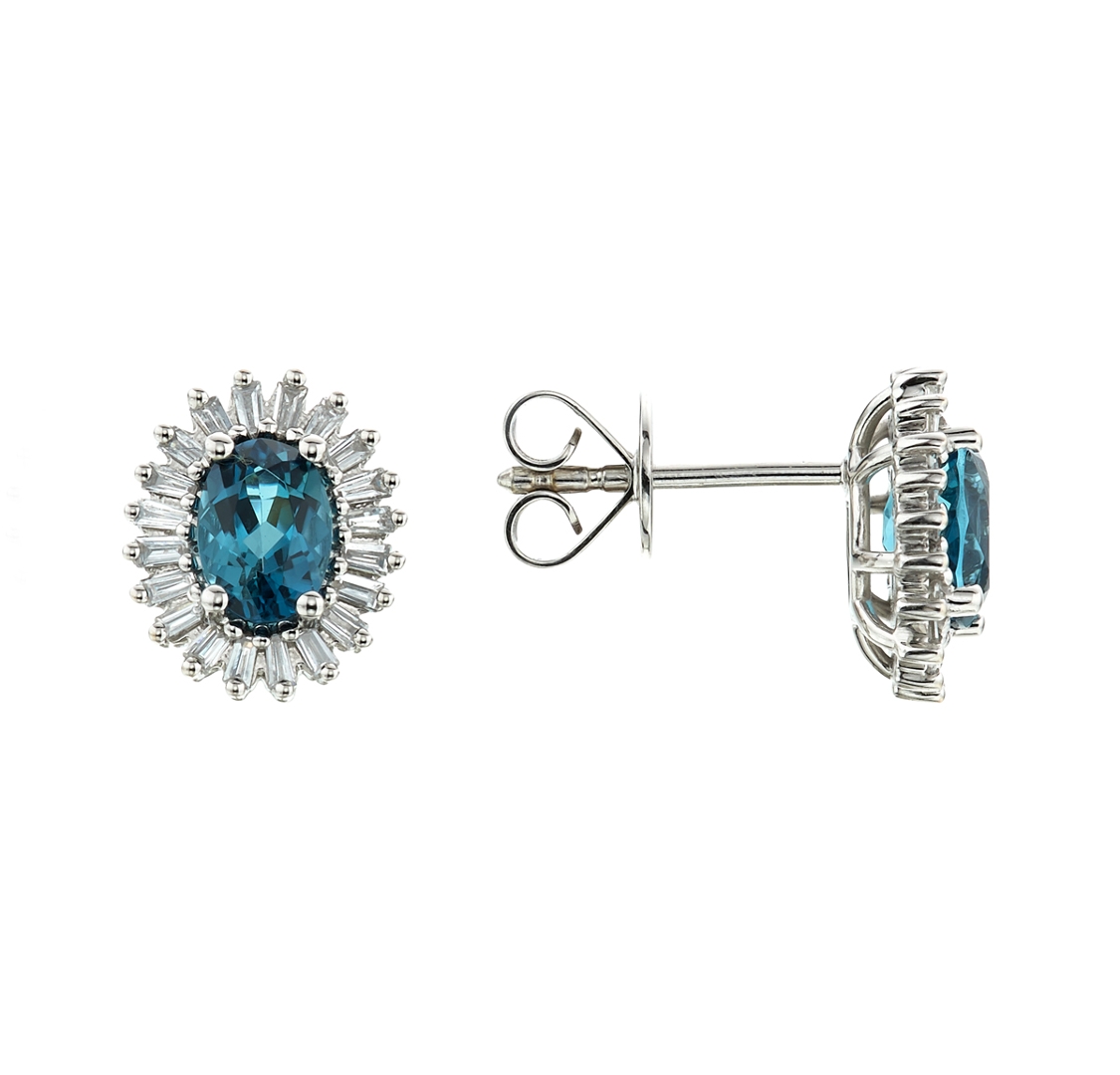 A brand-new, unused certified pair of natural diamond and blue tourmaline gemstone cluster earrings, beautifully crafted in luxurious 18ct white gold. Each earring showcases an elegant oval mixed-cut blue tourmaline weighing 1.10 carats, with a rich, vibrant blue hue that radiates sophistication and depth. Surrounding each gemstone is a refined halo of tapered baguette-cut natural diamonds, totalling 0.33 carats, with exceptional F-G colour and VS1–VS2 clarity. The precision-cut diamonds add a sleek, geometric brilliance that perfectly complements the tourmalines' smooth lustre, while the white gold setting enhances their crisp, contemporary elegance.