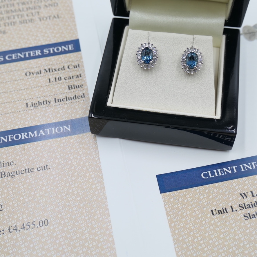 A brand-new, unused certified pair of natural diamond and blue tourmaline gemstone cluster earrings, beautifully crafted in luxurious 18ct white gold. Each earring showcases an elegant oval mixed-cut blue tourmaline, weighing 1.10 carats and displaying a rich, vibrant blue hue that radiates sophistication and depth. Surrounding each gemstone is a refined halo of tapered baguette-cut natural diamonds, totalling 0.33 carats, with exceptional F-G colour and VS1–VS2 clarity. The precision-cut diamonds add a sleek, geometric brilliance that perfectly complements the tourmalines' smooth lustre, while the white gold setting enhances their crisp, contemporary elegance.