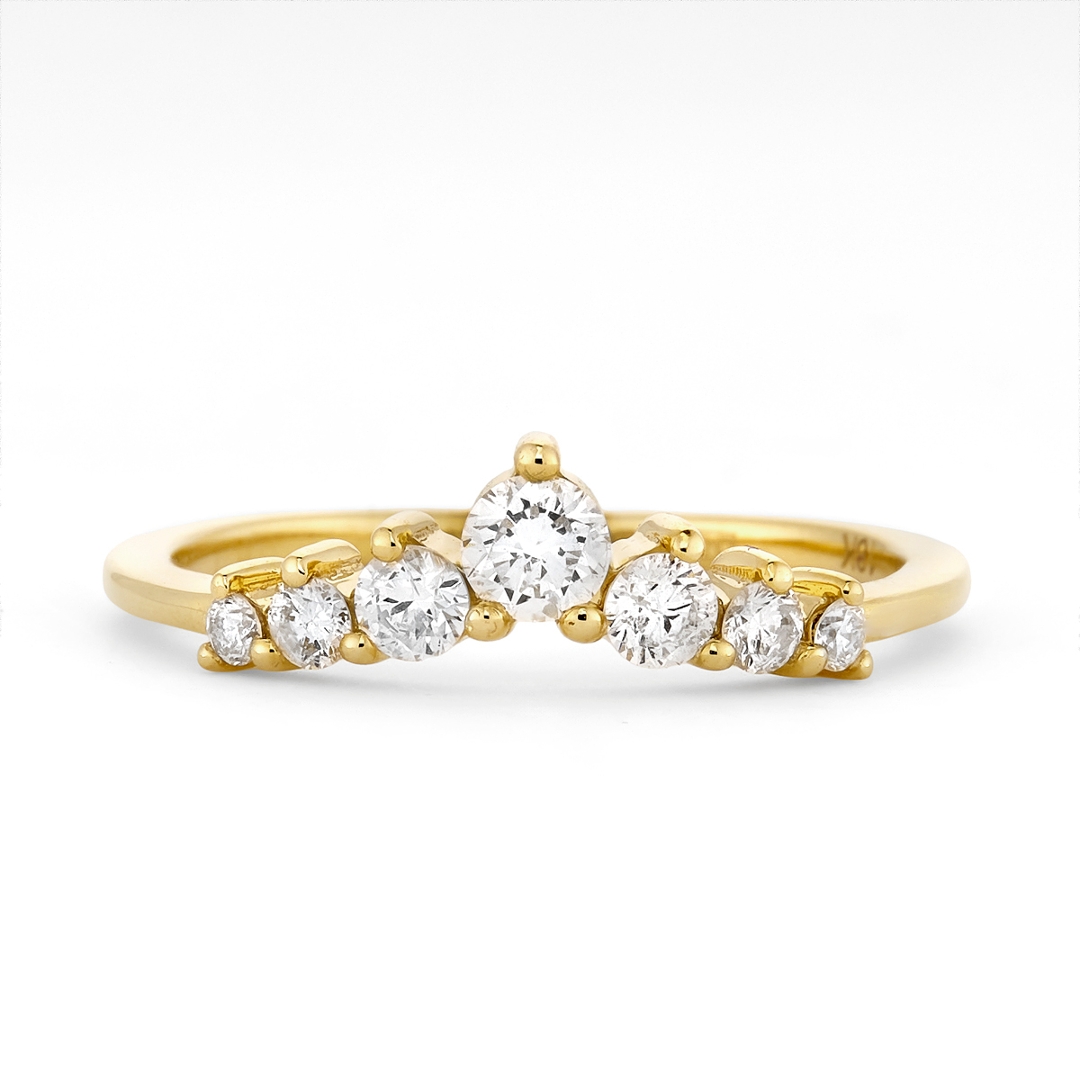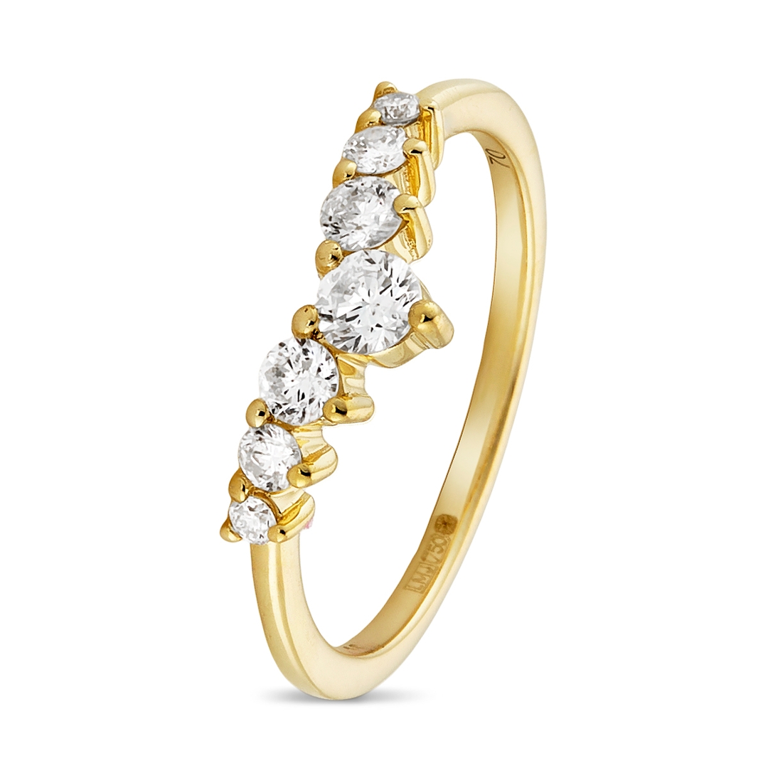 A brand-new, unused certified natural diamond wishbone eternity ring, set with seven brilliant-cut diamonds in 18ct yellow gold. With a total diamond weight of 0.47ct, the design offers a graceful and distinctive silhouette, with the wishbone shape naturally curving to follow the finger or sit neatly alongside another ring. The evenly spaced diamonds create a refined and continuous line of sparkle, enhanced by the warm tone of the yellow gold, which adds depth and a timeless character.