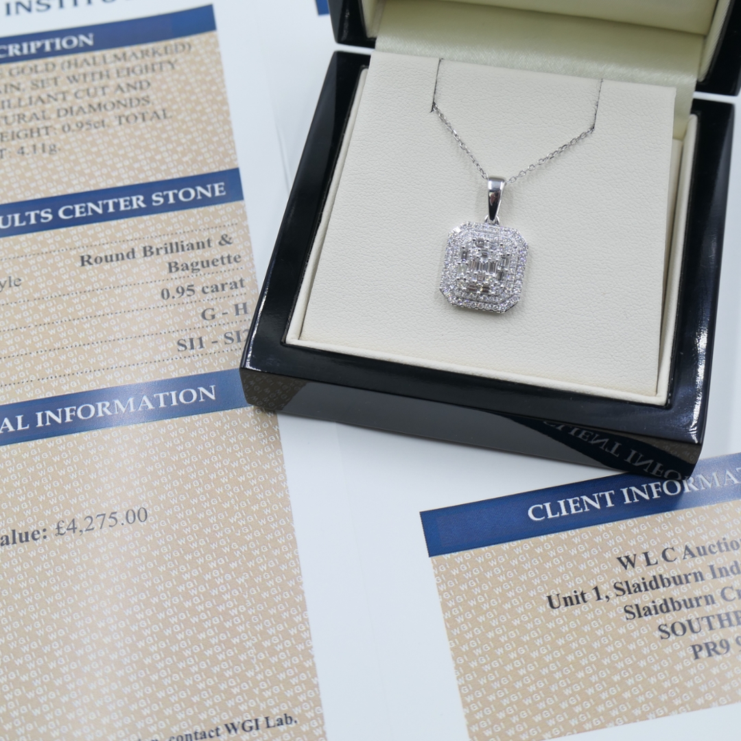 A brand-new, unused, certified 18ct white gold natural diamond asscher-shaped cluster pendant, exquisitely set with a dazzling combination of baguette-cut and brilliant-cut diamonds totalling 0.95 carats. The interplay of shapes creates a mesmerising display of sparkle and symmetry, highlighting the precise craftsmanship that defines fine diamond jewellery. With G–H colour and SI1–SI2 clarity, these near-colourless diamonds radiate a bright, crisp brilliance that contrasts beautifully with the luminous white gold setting, giving the pendant an effortlessly elegant, refined appearance suitable for every occasion.
