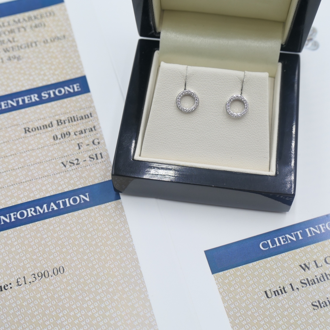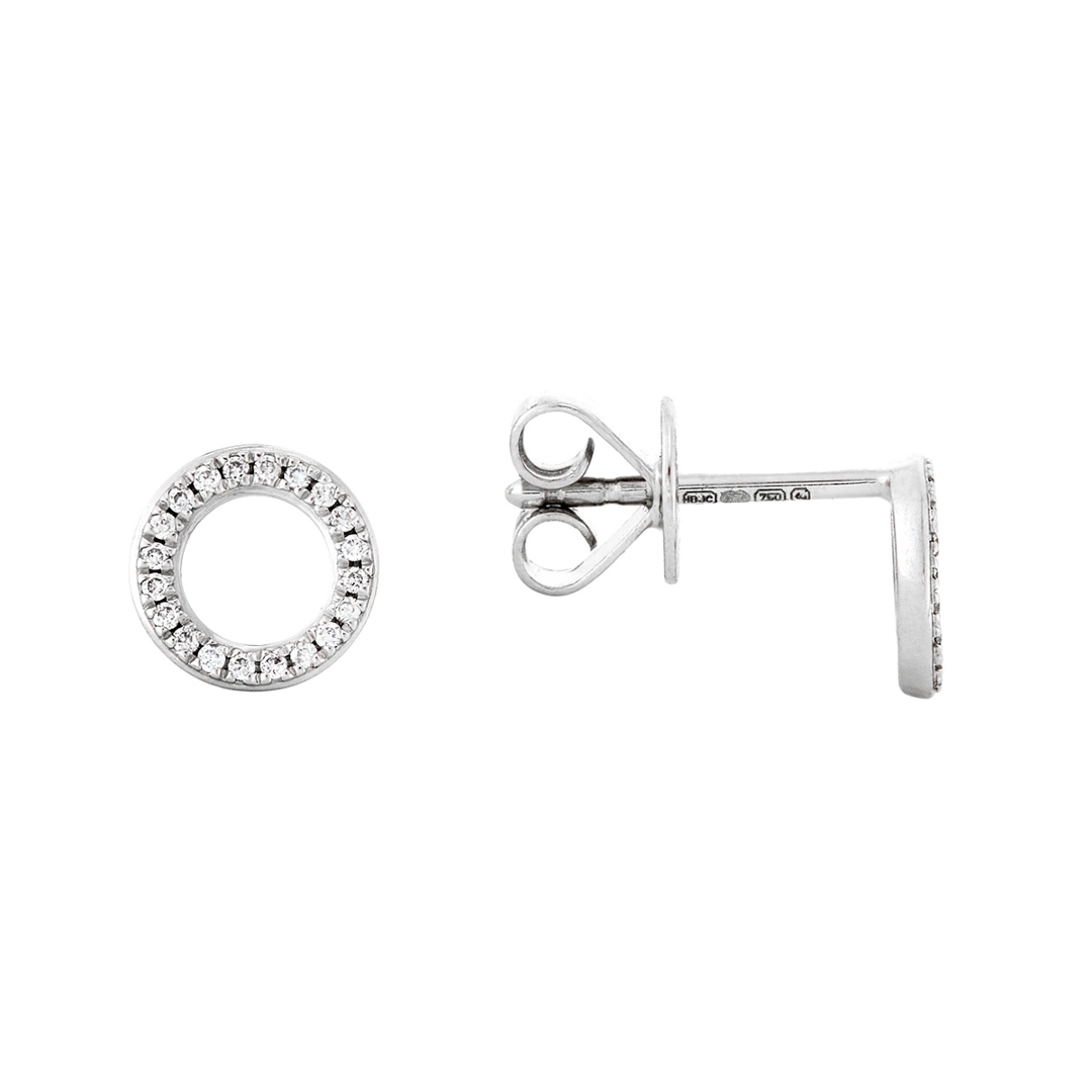 Crafted from polished 18ct white gold, weighing 1.49 grams, the sleek circle-shaped setting symbolises wholeness and continuity, while offering a clean, contemporary edge. The cool tones of the white gold provide the perfect backdrop for the diamonds’ natural sparkle, making these earrings effortlessly versatile for both everyday wear and more refined occasions.
