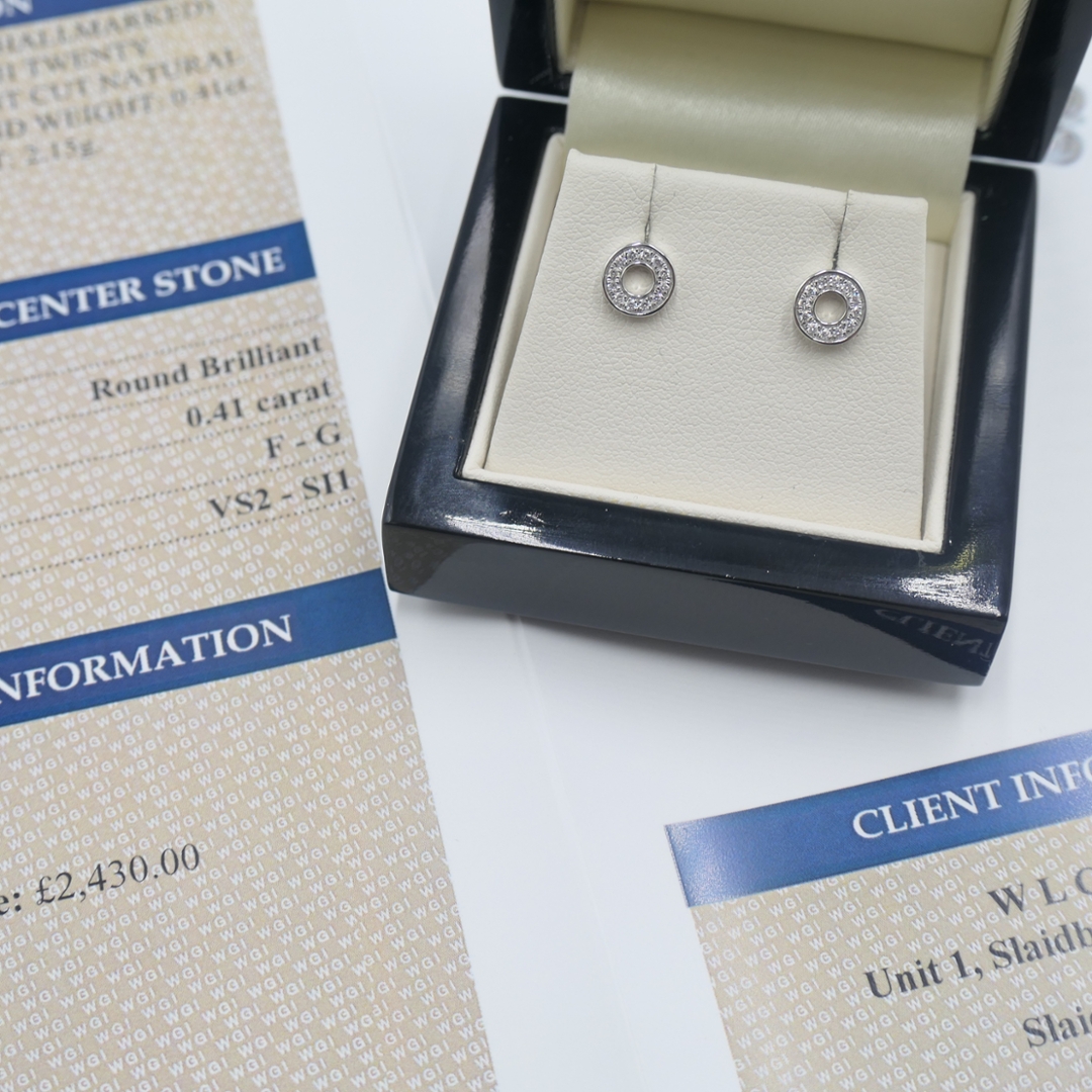 A brand-new, unused, certified pair of 18ct white gold natural diamond circle-shaped cluster earrings, these luxurious pieces offer a radiant display of timeless style and refined sparkle. Each earring is adorned with a carefully arranged cluster of brilliant-cut natural diamonds, totalling an impressive 0.41ct. Graded VS2 to SI1 in clarity and F to G in colour, the diamonds showcase a dazzling brilliance with exceptional clarity, delivering maximum sparkle and elegance from every angle.