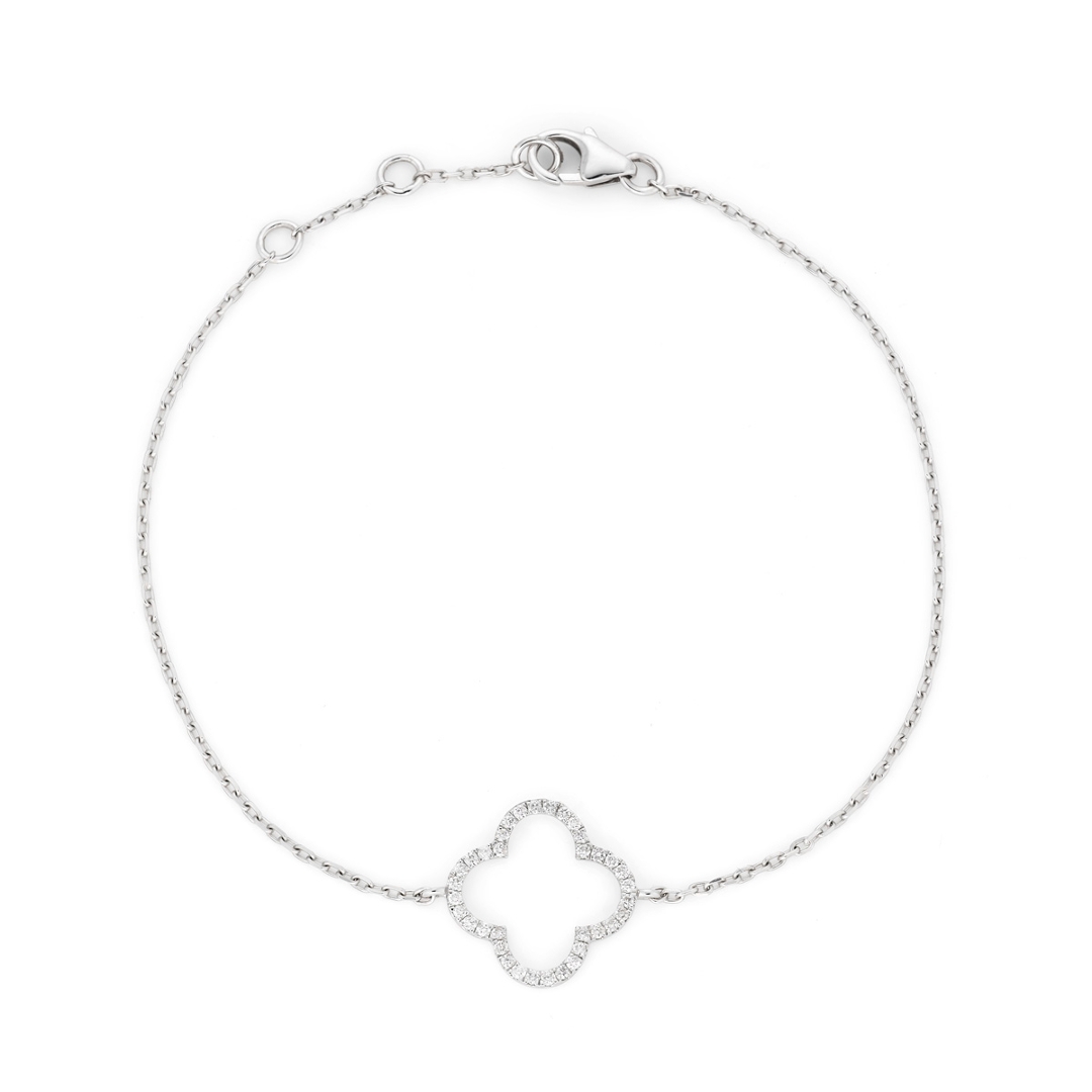 A brand-new, unused 18ct white gold diamond bracelet showcasing the timeless appeal and natural beauty of earth-formed diamonds. Crafted with exceptional precision, this elegant piece features a delicate chain adorned with a stunning four-leaf clover motif, symbolising luck and love. The clover is beautifully set with thirty-six round brilliant-cut natural diamonds, totalling 0.18ct, each carefully selected for its sparkle and radiance. Graded G–H in colour and SI1–SI2 in clarity, the diamonds offer a soft, captivating brilliance that complements the fine white gold setting perfectly.