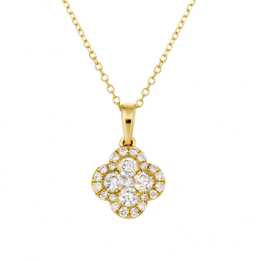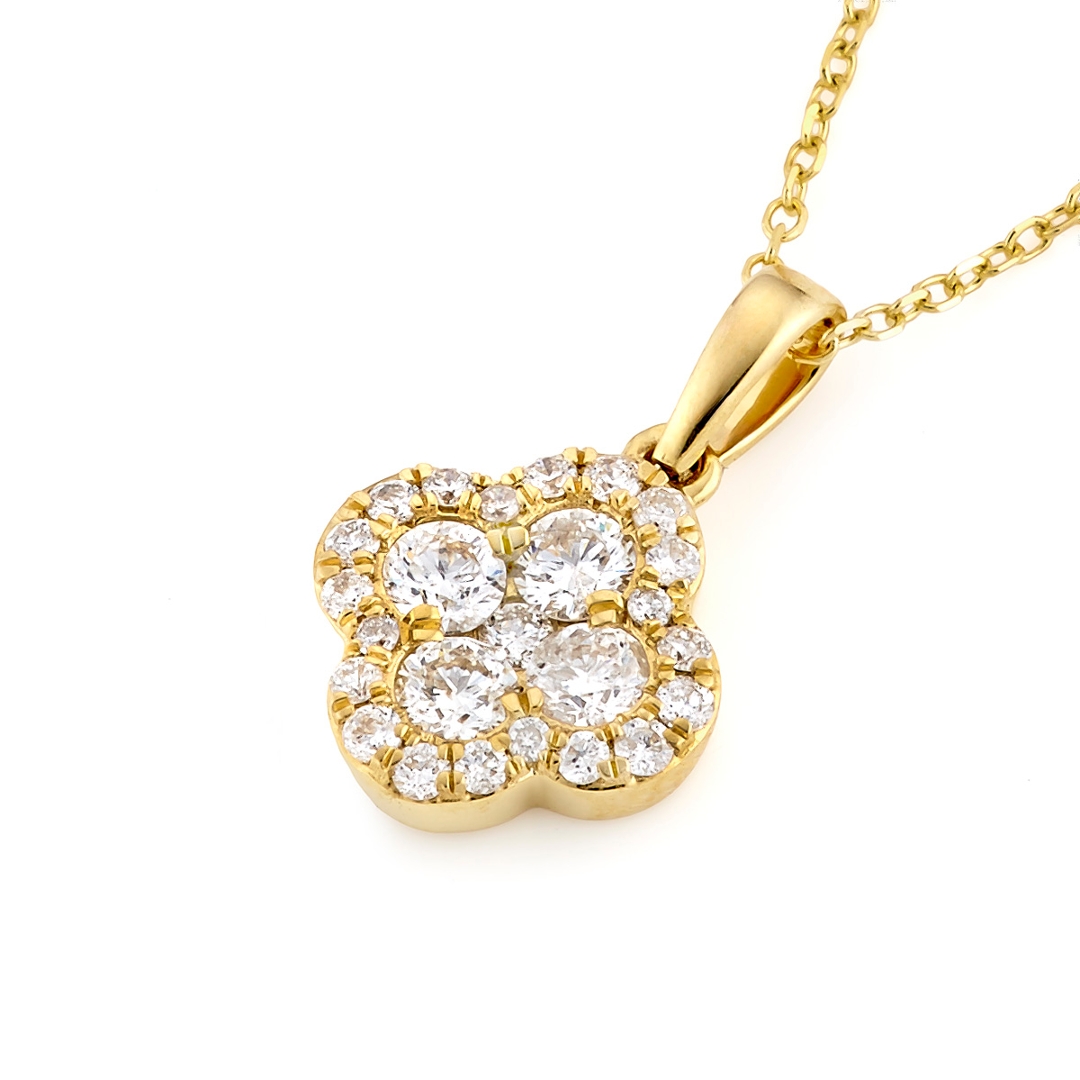 A brand-new, unused, certified natural diamond clover-shaped cluster pendant, set with five brilliant cut diamonds to the centre & a cluster of brilliant cut diamonds in a halo setting, set in 18ct yellow gold.