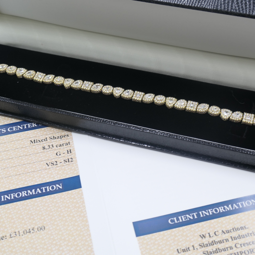 A brand-new, unused 18ct yellow gold diamond bracelet that radiates timeless sophistication and brilliance. This exceptional piece is intricately set with a mesmerising cluster of mixed-cut natural diamonds, totalling an impressive 8.33 carats. With a weight of 18.25 grams. Each diamond, graded G–H in colour and VS2–SI2 in clarity, has been expertly selected for its vibrant fire and clarity, creating a dynamic display of sparkle that dances beautifully against the warm tones of rich yellow gold. The combination of cuts and the precision of craftsmanship results in a bracelet that exudes both refinement and opulence.