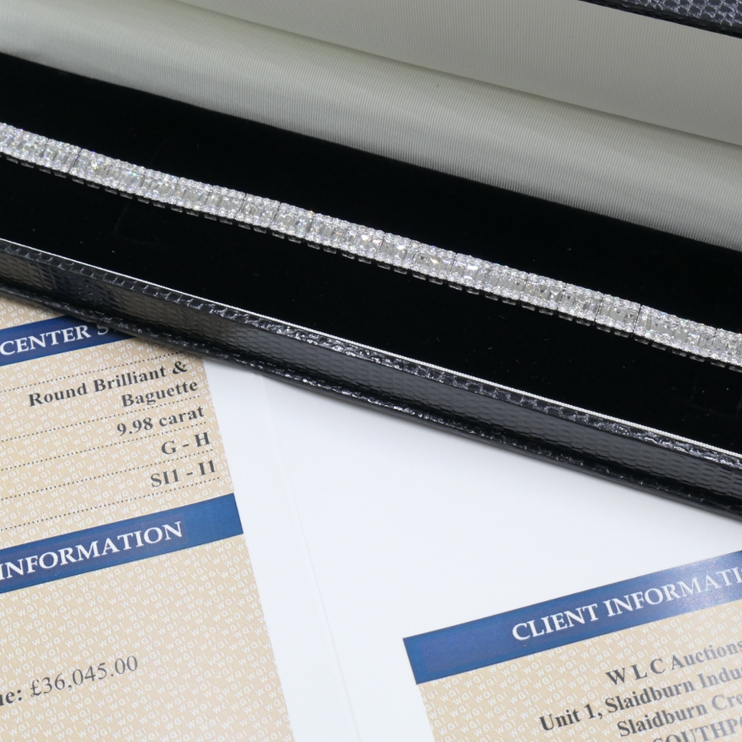 A brand-new, unused 18ct white gold diamond bracelet that captures the essence of luxury and timeless refinement. Weighing an impressive 17.50 grams. This magnificent piece is adorned with an impressive array of baguette- and round-brilliant-cut natural diamonds, totalling 9.98 carats. Each diamond, graded G–H in colour and SI1–I1 in clarity, has been expertly arranged to create a breathtaking flow of radiance that glimmers effortlessly across the wrist. The contrasting shapes of the baguette and brilliant cuts combine to deliver a spectacular display of light, depth, and sophistication, making this bracelet a truly captivating statement of style.