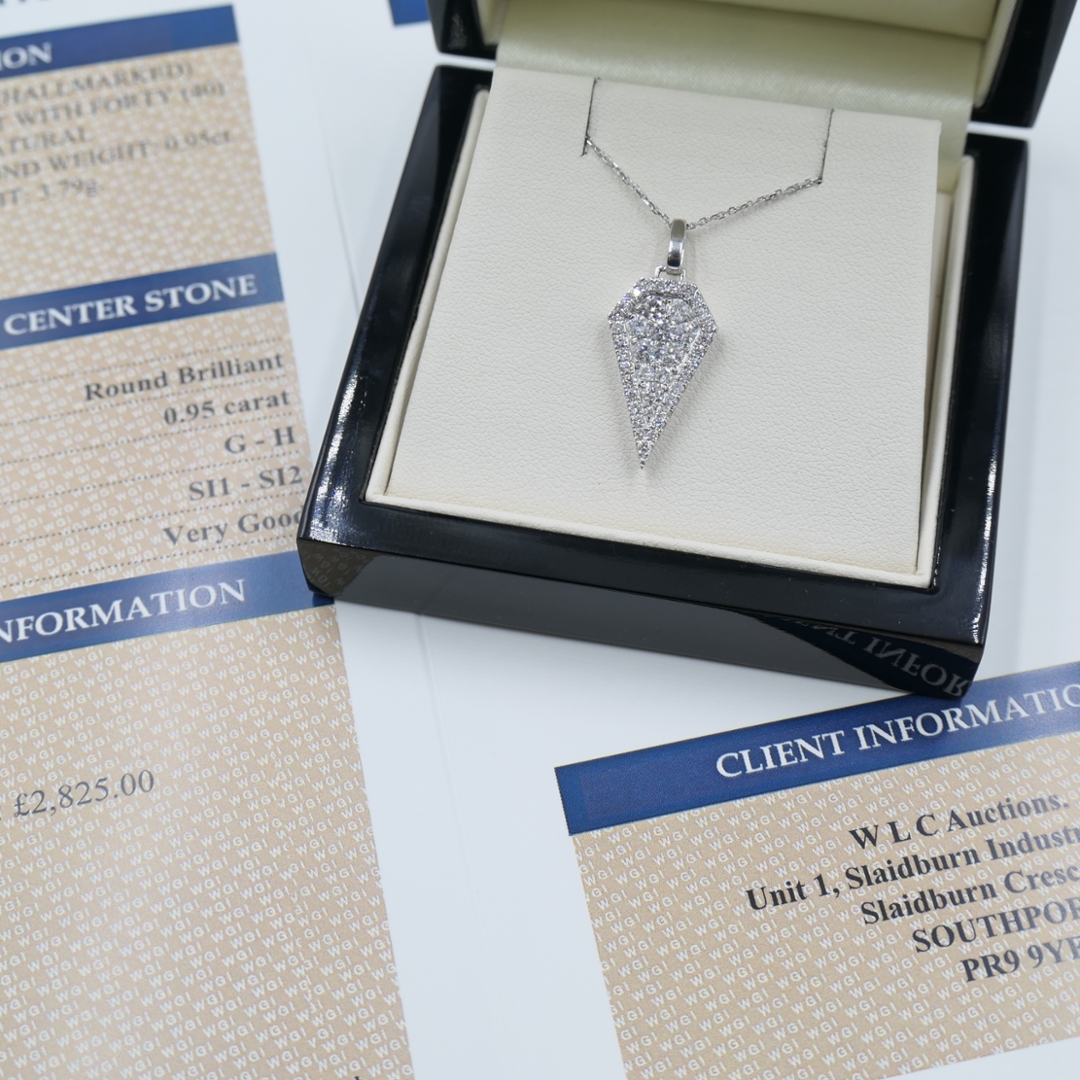 A brand-new, unused certified 9ct white gold natural diamond cluster pendant, showcasing a mesmerising arrangement of forty round brilliant-cut diamonds totalling 0.95 carats. Each diamond has been carefully selected for its superior sparkle and uniformity, graded G–H in colour and SI1–SI2 in clarity. The precision of the cut ensures maximum brilliance, while the refined white gold setting enhances the diamonds’ natural radiance. Its distinctive geometric silhouette exudes a bold yet elegant charm, making it an exceptional statement of sophistication and craftsmanship.