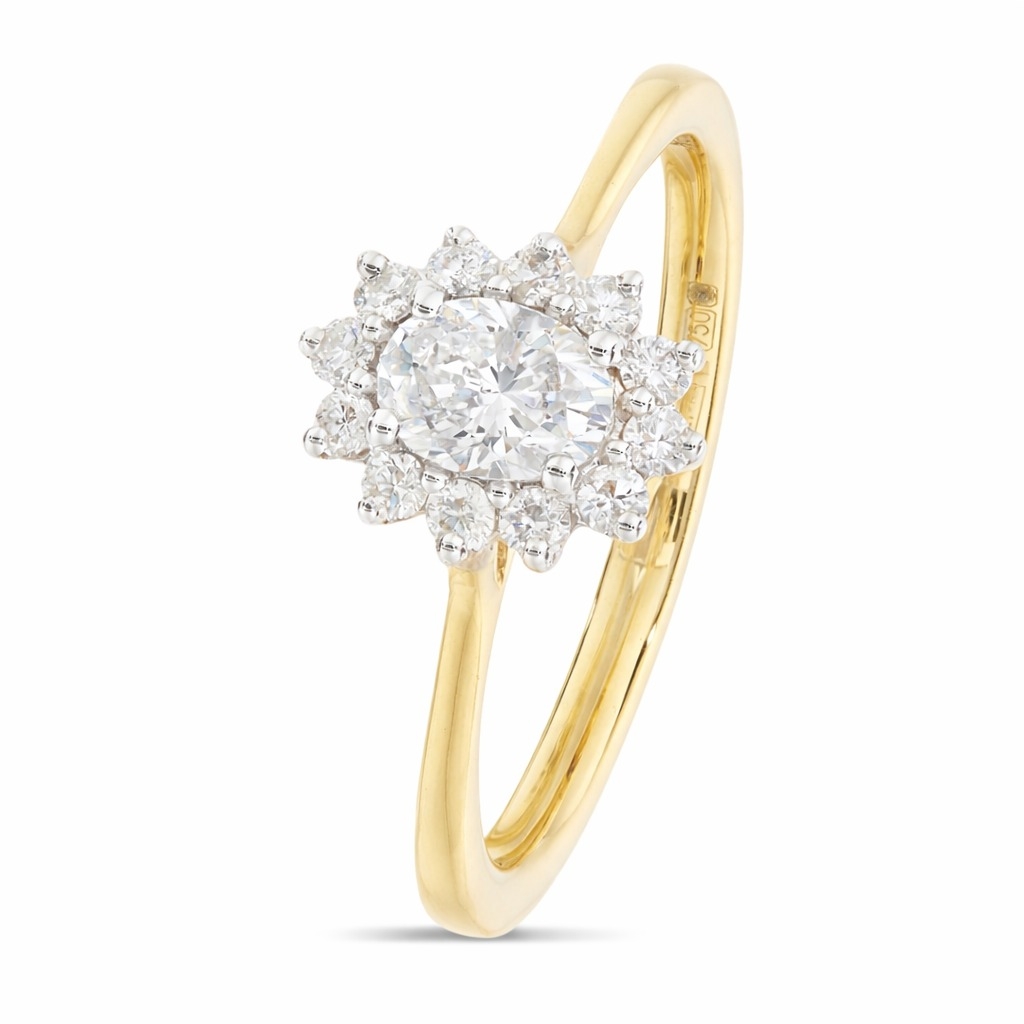 A brand-new, unused, certified 18ct yellow gold natural diamond cluster ring combines elegance with sophistication. At the heart of this exquisite ring lies a captivating oval-cut diamond weighing 0.47 carats, with a clarity grade of SI1 and a colour grade of G. The oval cut is renowned for its brilliance and elongated shape, which enhances the diamond's sparkle and allure. Surrounding the oval diamond is a halo of brilliant-cut diamonds totalling 0.10 carats. These smaller diamonds are carefully selected for their clarity grade of SI1 and colour grade ranging from F to G, ensuring they complement the centre stone beautifully and enhance the overall radiance of the ring.
