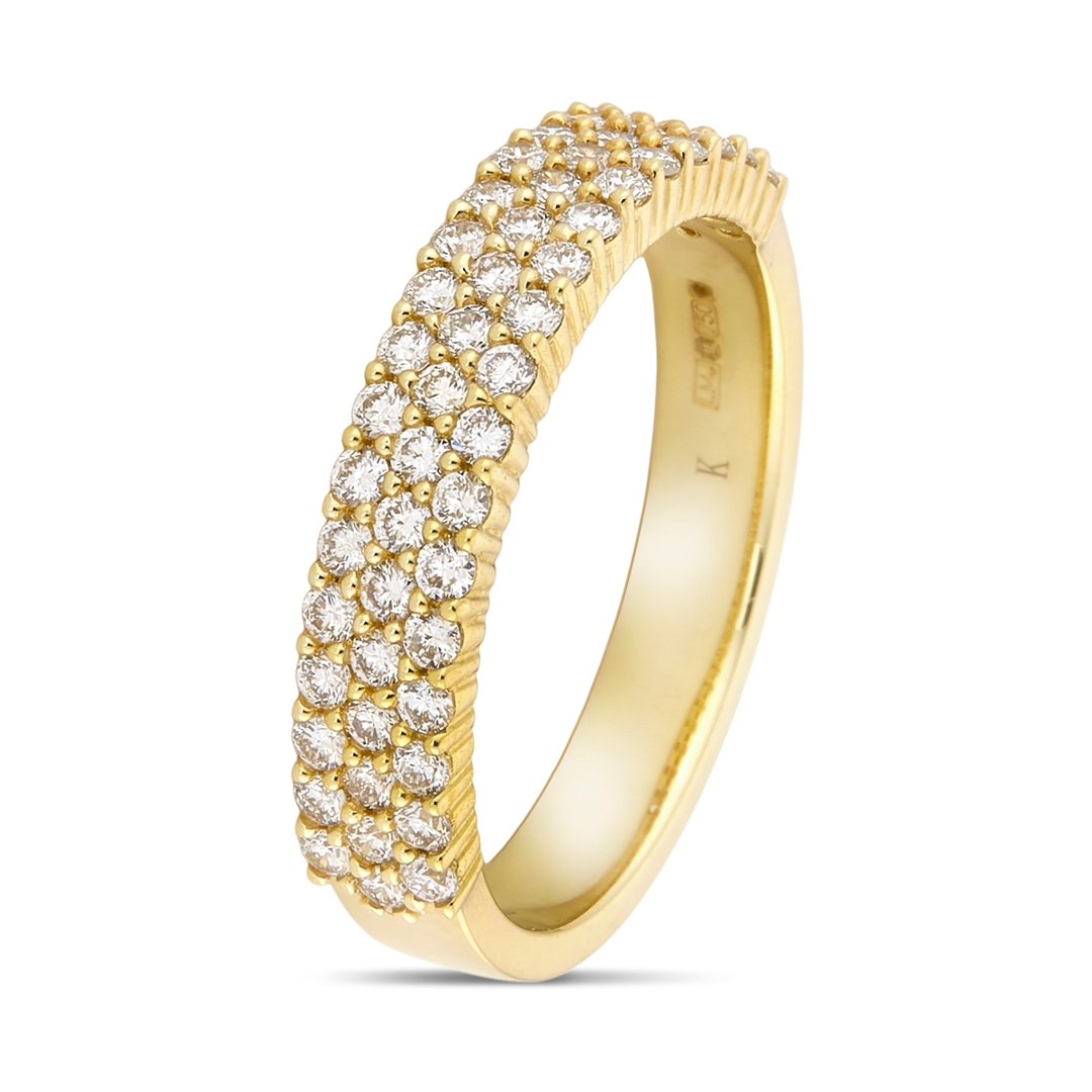 A brand-new, unused, certified natural diamond cluster ring, with a cluster of brilliant cut diamonds in a 3-row design, set in 18ct yellow gold.