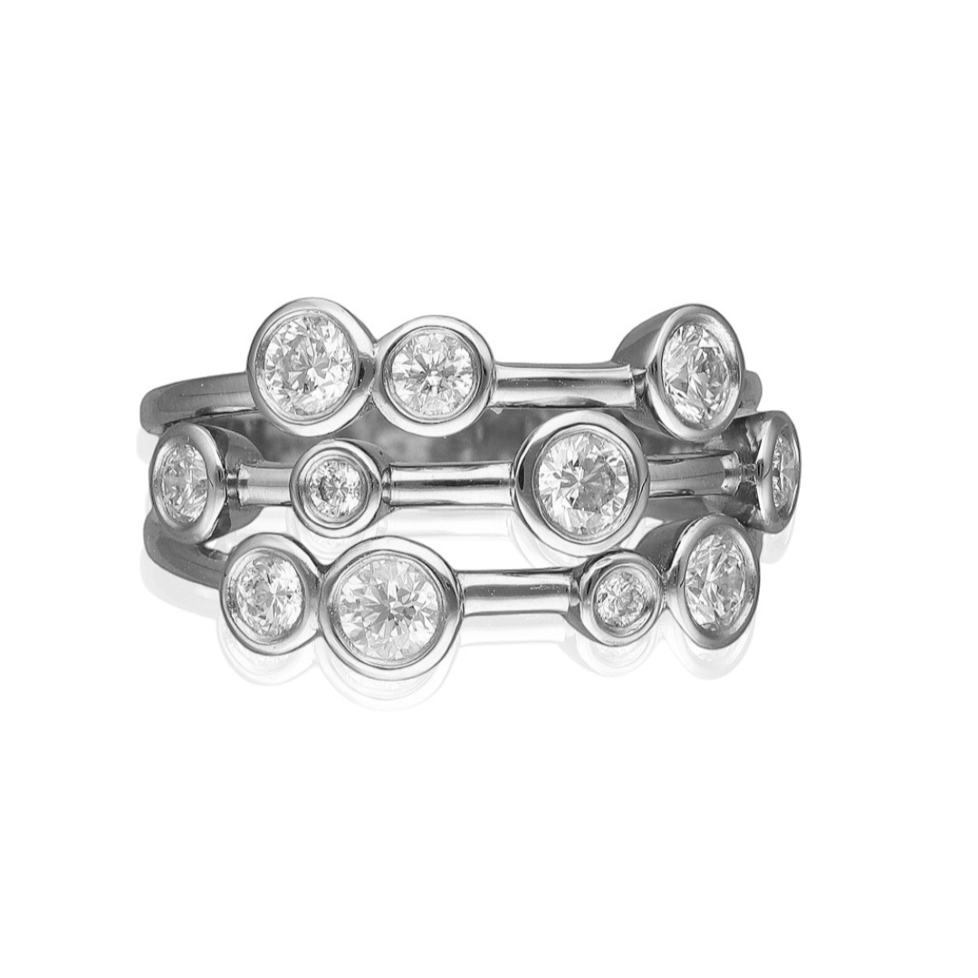 The brilliant-cut diamonds are meticulously arranged in a cluster setting, creating an eye-catching display of light and radiance. This design maximises the brilliance of each diamond, resulting in a dazzling effect that catches the light from every angle. The cluster style adds a unique, vintage-inspired charm while maintaining a contemporary feel with its sleek platinum band.