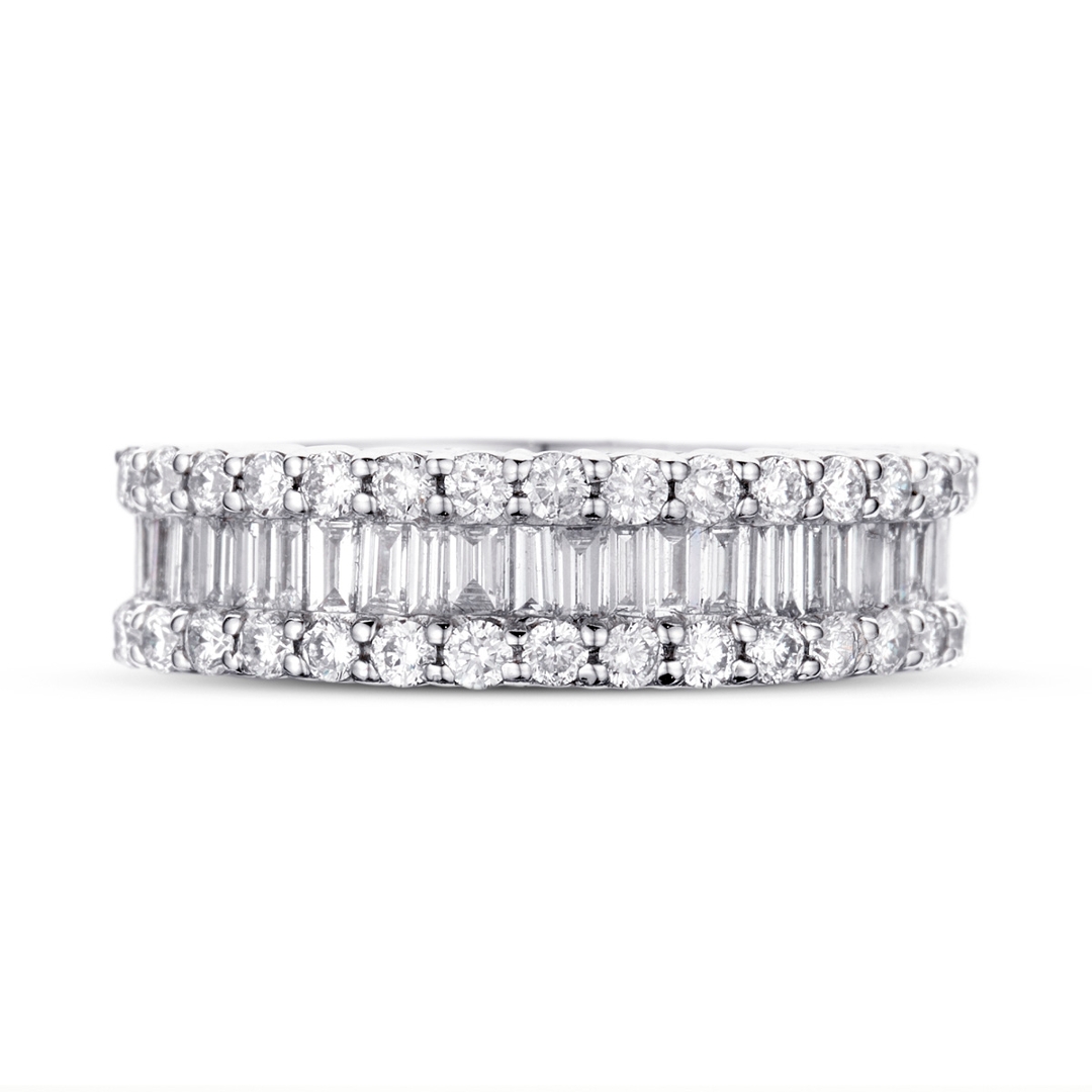 The total diamond weight is 1.10 ct, with each diamond carefully selected for exceptional clarity and brilliance. Graded VS2-SI1 for clarity and G-H for colour, the diamonds offer remarkable sparkle and fire, ensuring the ring shines beautifully from every angle. The brilliant-cut diamonds provide a vibrant burst of light, while the baguette-cut diamonds lend a refined, sleek touch to the design.