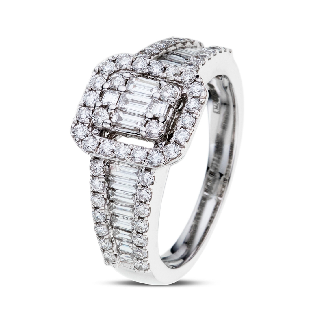 A brand-new, unused, certified natural diamond cluster ring, set with baguette-cut and brilliant-cut diamonds in the centre and on the shoulders, in 18ct white gold.