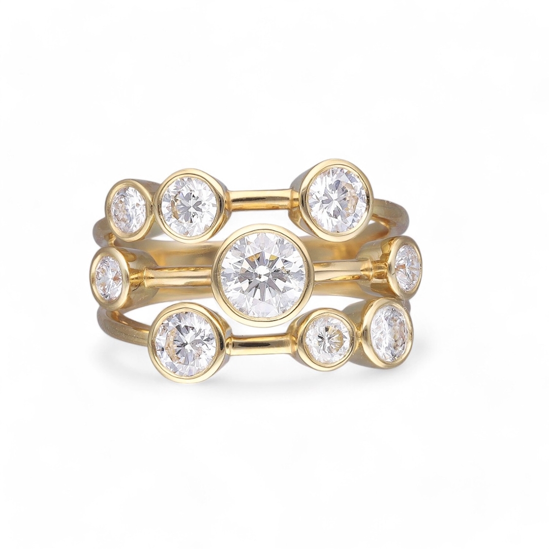 The warm hue of the yellow gold setting provides a rich contrast to the bright, white diamonds, enhancing their radiance. This cluster ring design offers a luxurious look with a bold, yet sophisticated style, perfect for those who appreciate classic elegance.