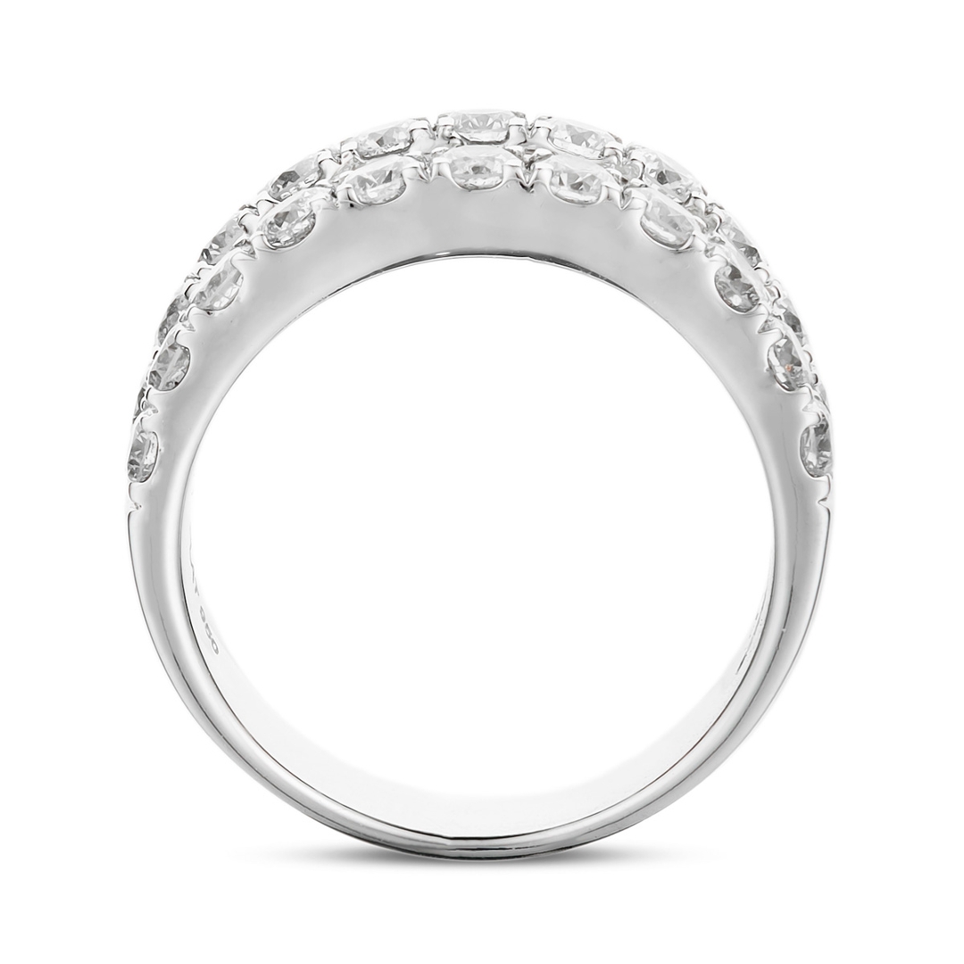 The ring's design masterfully blends elegance and luxury, with the platinum setting providing a durable and lustrous backdrop that accentuates the diamonds' radiance. The combination of baguette and brilliant-cut diamonds creates a captivating visual contrast, with the baguette cuts adding a sleek, linear sophistication and the brilliant cuts contributing a scintillating shimmer. This harmonious blend of diamond cuts results in a unique and eye-catching design that stands out in any collection.