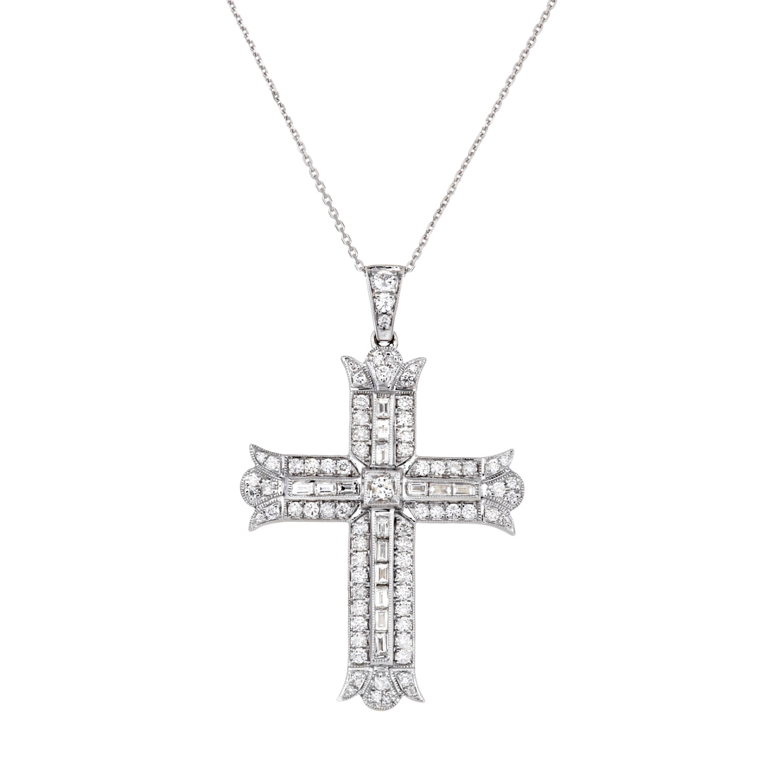A brand-new, unused, certified natural diamond cross pendant, set with a cluster of baguette-cut & brilliant cut diamonds, set in 9ct white gold.
