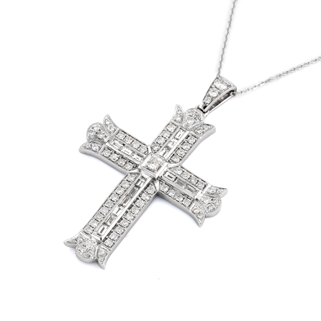 A brand-new, unused 9ct white gold diamond pendant that beautifully blends faith and elegance in a timeless cross design. This exquisite piece is intricately set with a stunning arrangement of baguette-cut and brilliant-cut natural diamonds, totalling 1.17 carats. Each diamond, graded G–H in colour and VS2–SI2 in clarity, has been expertly placed to maximise brilliance and fire, resulting in a radiant display of light from every angle. The crisp white gold setting enhances the diamonds' natural luminosity, creating a look that is both refined and strikingly luxurious.
