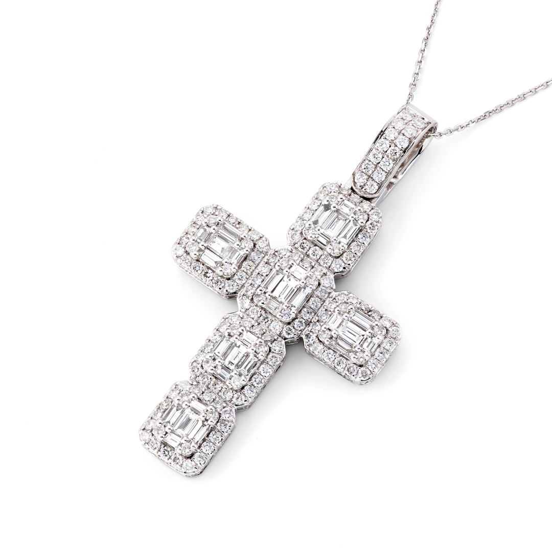 A brand-new, unused, certified natural diamond cross pendant, set with a cluster of baguette-cut & brilliant cut diamonds, set in 9ct white gold.