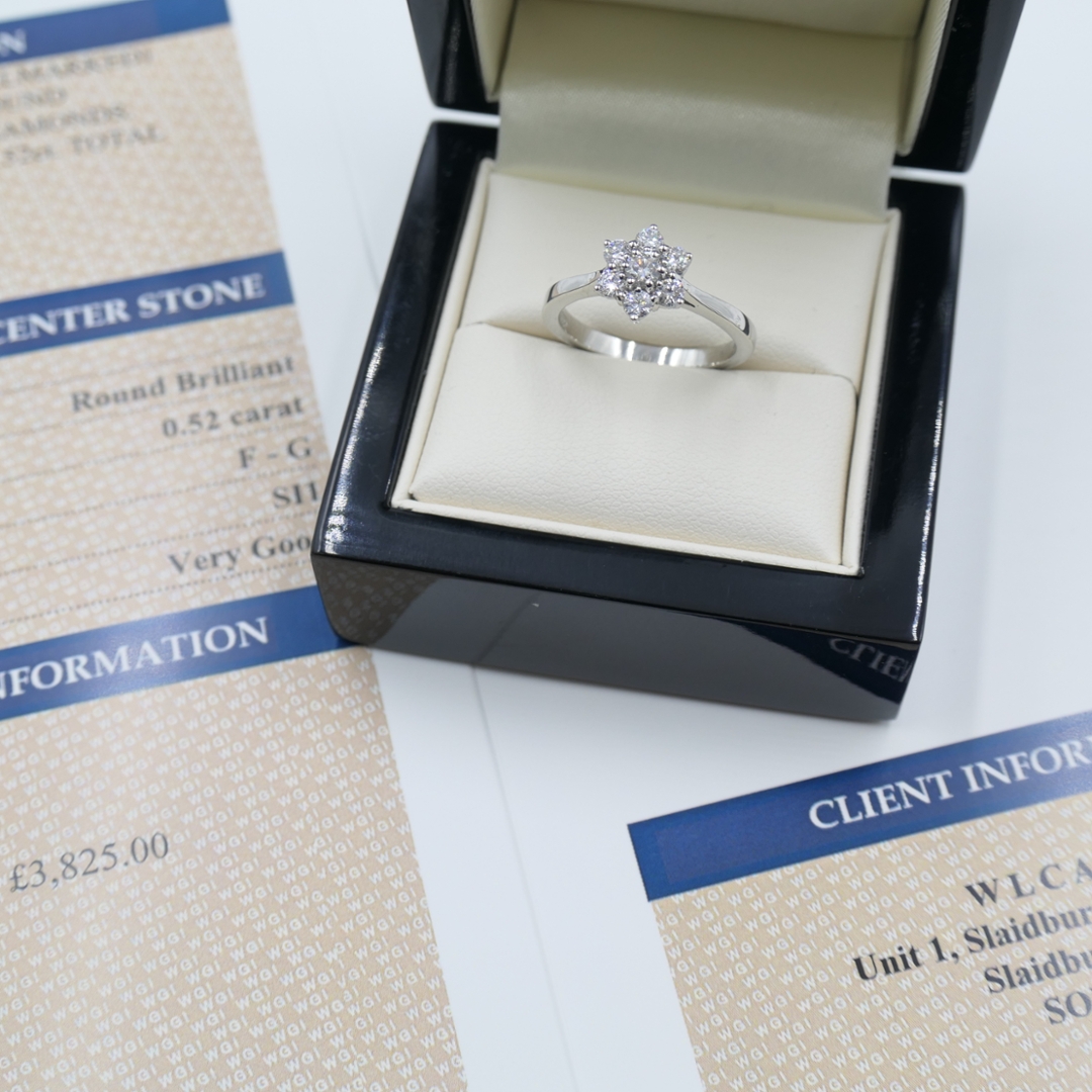 A brand-new, unused certified natural diamond cluster ring, beautifully crafted in platinum. This elegant design features seven brilliant-cut natural diamonds arranged in a charming daisy-shaped cluster, together weighing 0.52 carats. The diamonds, with exceptional F-G colour and SI1 clarity, radiate a captivating brilliance that catches the light from every angle. The platinum setting enhances their crisp sparkle with its cool, silvery sheen, creating a perfect balance of timeless beauty and refined sophistication. The floral-inspired design adds a touch of classic romance, making it a versatile piece suited to both everyday elegance and special occasions.