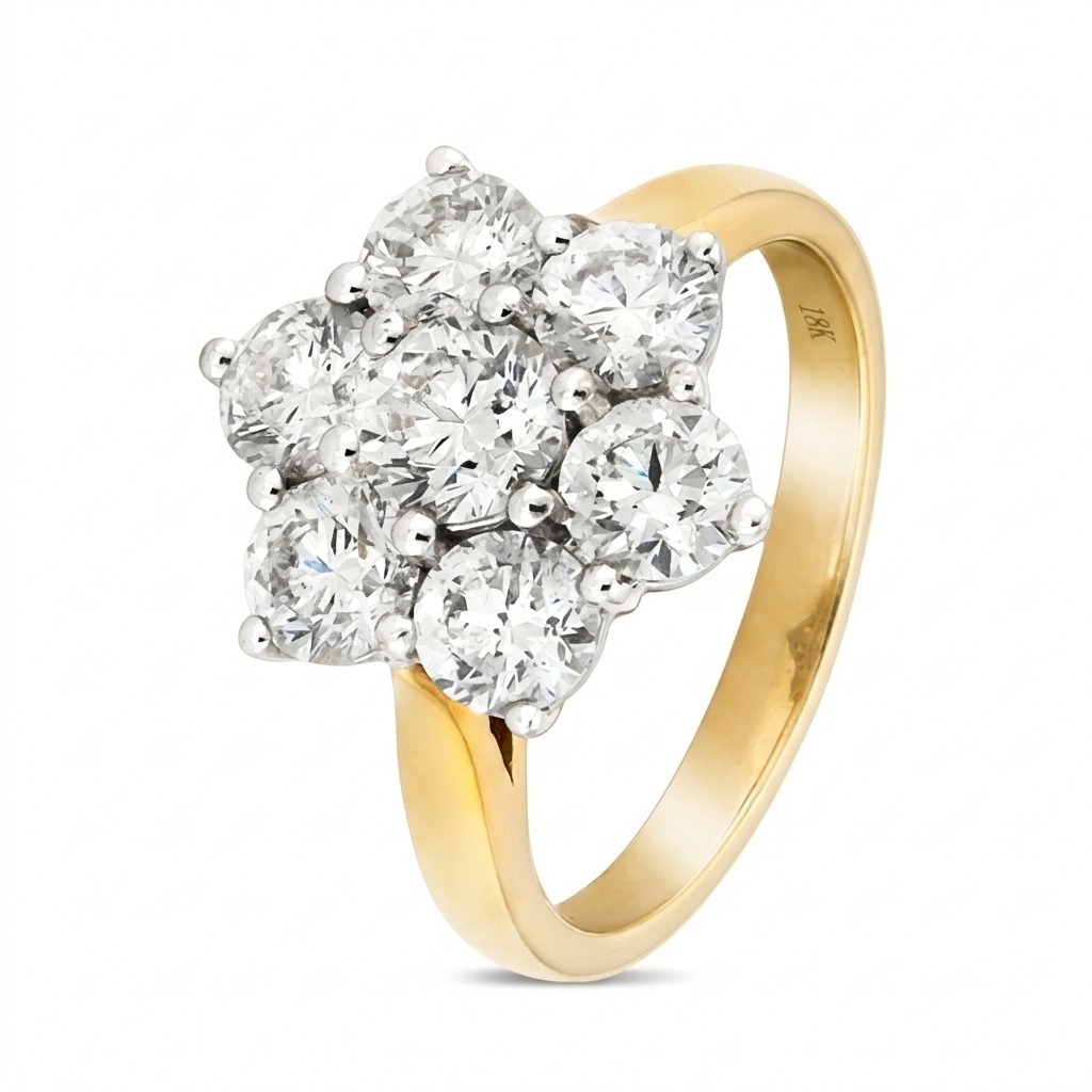 A brand-new, unused, certified natural diamond daisy-shaped cluster ring, this magnificent piece exudes timeless elegance and radiant brilliance. Expertly crafted in a luxurious blend of 18ct yellow and white gold, it features seven perfectly matched brilliant-cut natural diamonds, together weighing an impressive 3.10 carats. Each diamond, graded G–H in colour and SI1 in clarity, displays remarkable fire and sparkle, their collective brilliance forming a dazzling floral cluster that captures light with breathtaking intensity. The design’s symmetry and balance evoke classic beauty, while the exceptional craftsmanship ensures enduring sophistication.