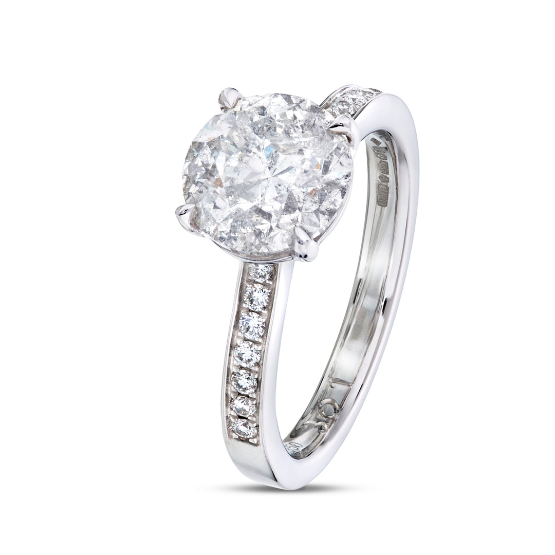 The principal diamond, graded J in colour with I1 clarity, delivers a bold visual impact, with its substantial size ensuring strong light performance and presence on the hand. Supporting this, the shoulder diamonds total 0.17ct, with SI1–SI2 clarity and H–I colour, adding a subtle yet effective enhancement of brilliance and balance to the overall design.