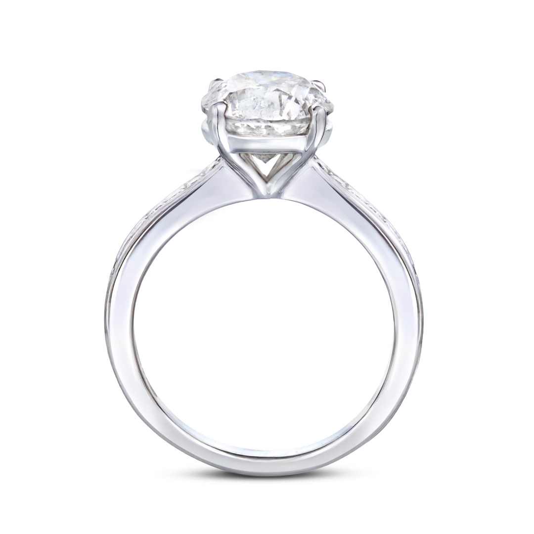 A brand-new, unused certified natural diamond solitaire engagement ring, set in platinum and centred with an impressive 3.01ct brilliant cut diamond, complemented by a delicate cluster of brilliant cut diamonds along the shoulders. The platinum setting provides a clean, contemporary finish while offering exceptional durability, allowing the diamonds to take centre stage with a confident and timeless presence.