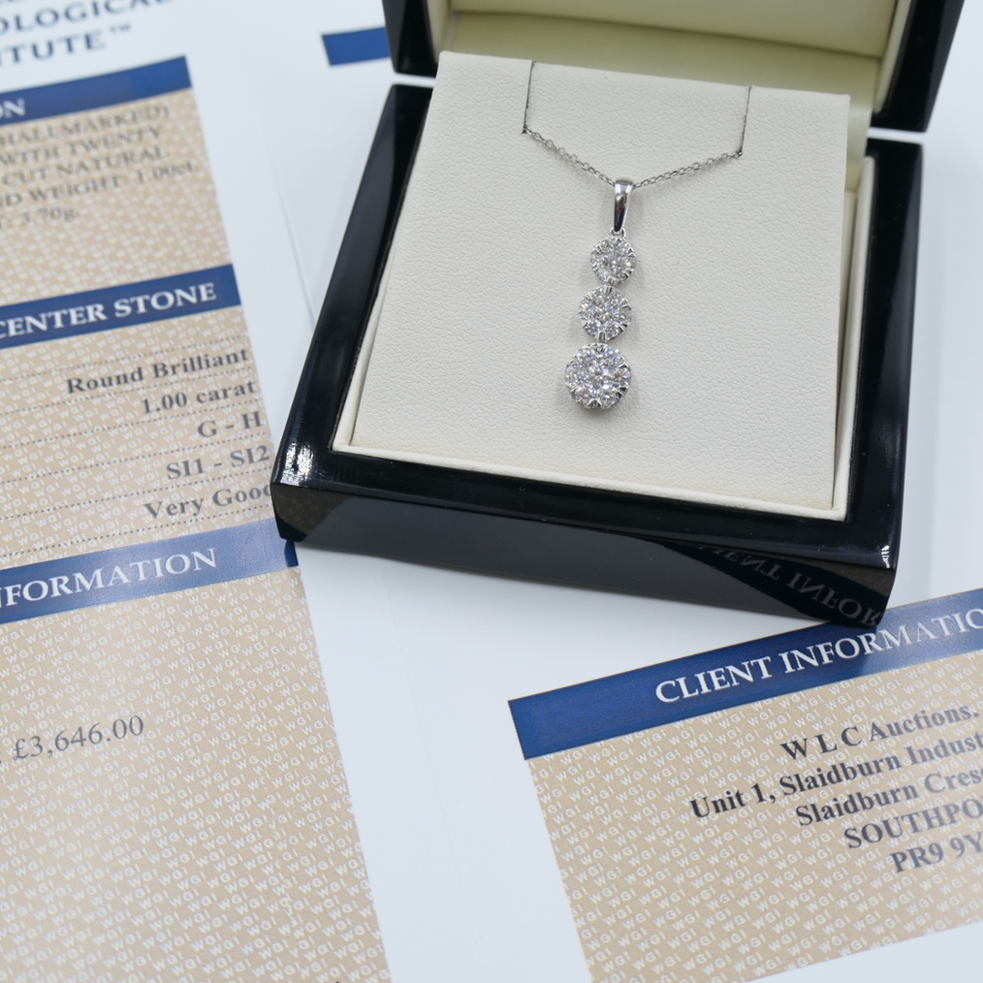 A brand-new, unused, certified 18ct white gold natural diamond droplet pendant, gracefully designed with three clusters of round brilliant-cut diamonds totalling 1.00 carat. Each cluster captures the essence of timeless elegance, with exceptional sparkle and clarity that radiate under any light. The flowing droplet formation embodies refined luxury, while the G–H colour and SI1–SI2 clarity ensure every diamond delivers lively brilliance and natural beauty. Crafted with precision, this pendant is a statement of enduring sophistication and understated glamour, ideal for elevating any occasion.