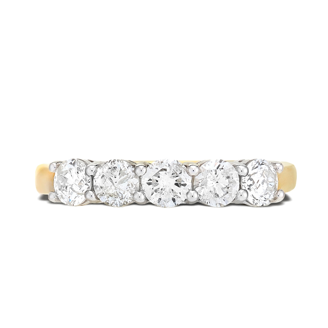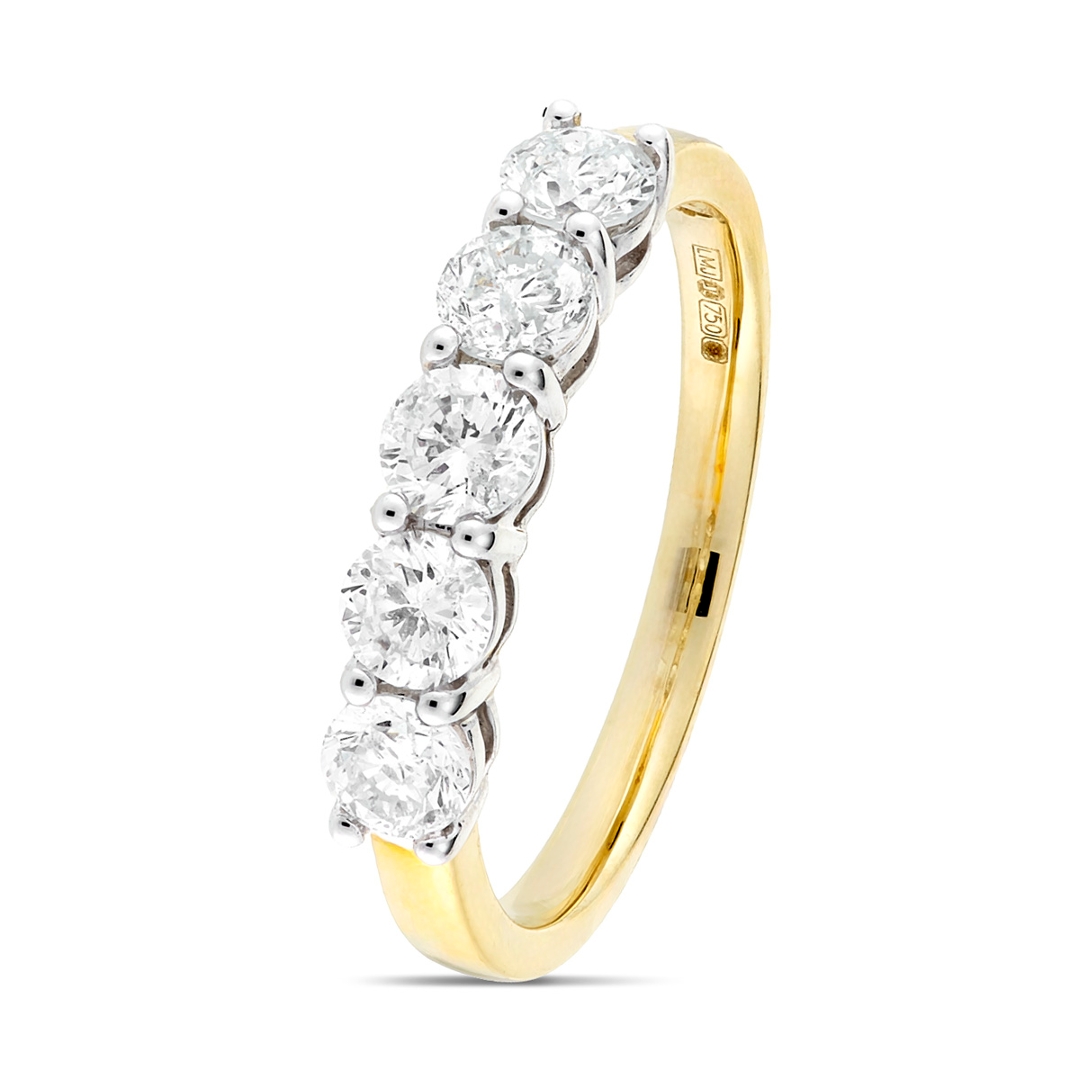 A brand-new, unused certified natural diamond five-stone eternity ring, set with five brilliant-cut diamonds in a refined combination of 18ct yellow and white gold. With a total diamond weight of 0.98 ct, the evenly spaced stones create a bright, continuous line of brilliance, offering a strong visual presence while maintaining a balanced and elegant profile. The contrast between the warm yellow gold and the white settings enhances each diamond, adding depth and definition to the overall design.