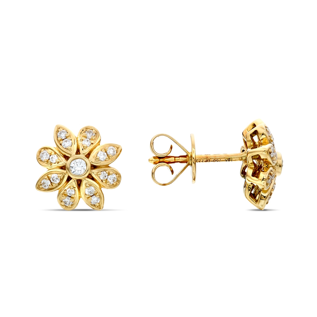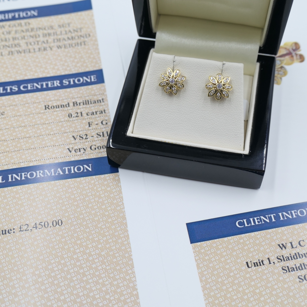 A brand-new, unused certified pair of natural diamond cluster earrings, beautifully crafted in 18ct yellow gold. Each earring features an elegant flower-shaped design adorned with a cluster of brilliant-cut natural diamonds, together weighing 0.21 carats. The diamonds, with exceptional F-G colour and VS2–SI1 clarity, display a captivating brilliance that catches the light from every angle. The warm glow of the yellow gold setting enhances the crisp sparkle of the diamonds, creating a harmonious balance of radiance and refinement. The floral design adds a timeless charm, making these earrings perfect for both everyday elegance and special occasions.