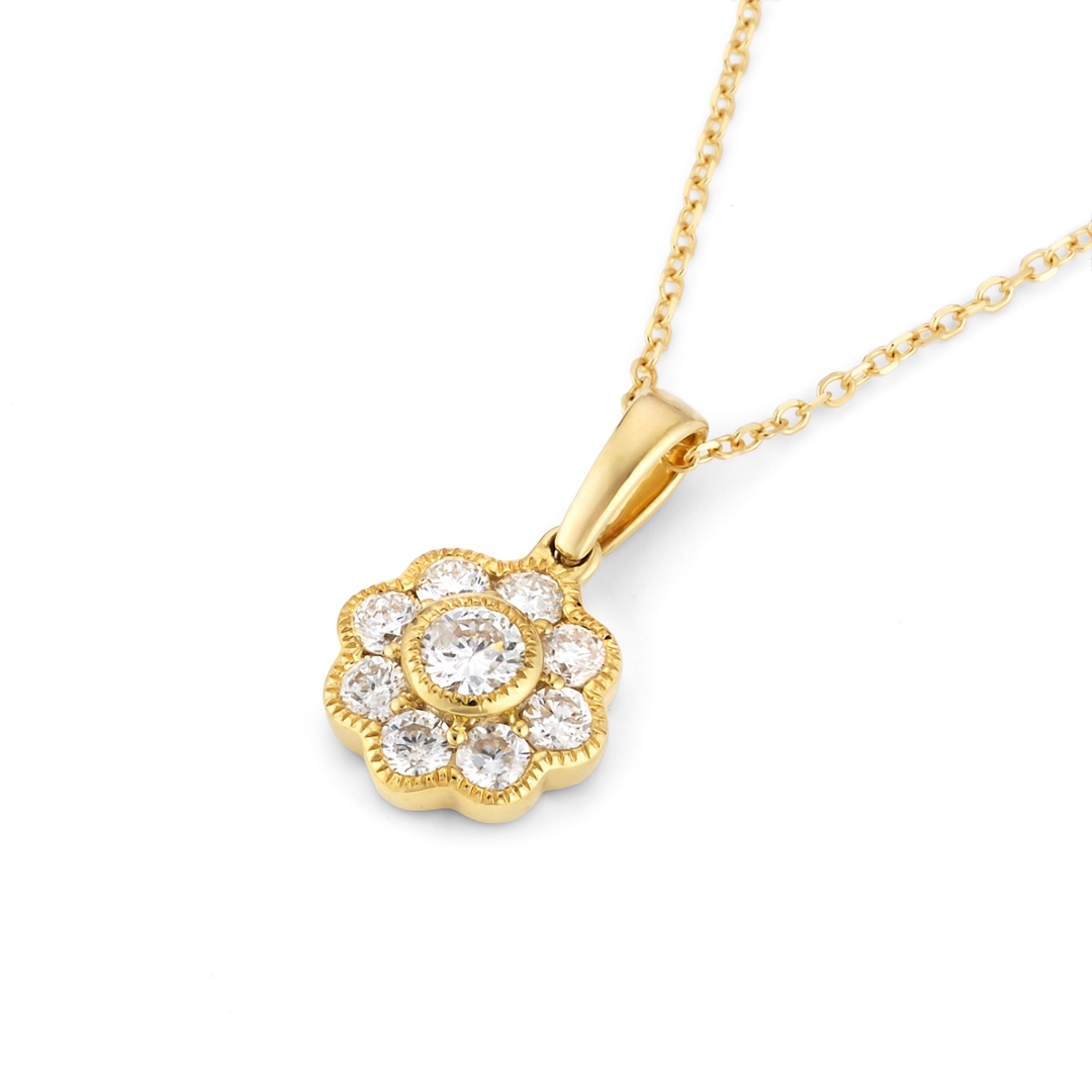 A brand-new, unused, certified natural diamond flower-shaped pendant, set with nine brilliant cut diamonds in a flower design, set in 18ct yellow gold.