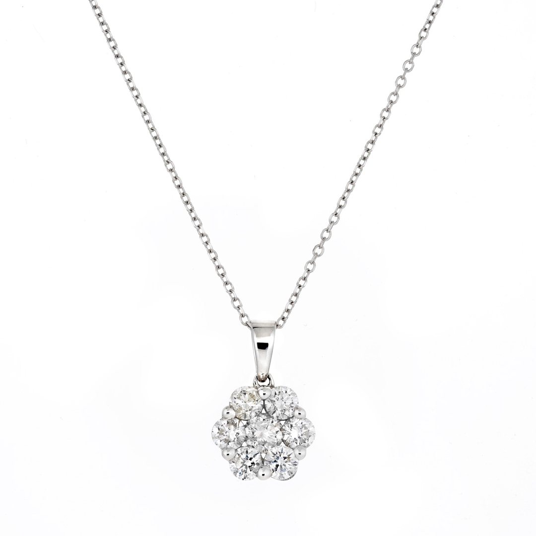 A brand-new, unused, certified 18ct white gold natural diamond flower-shaped pendant, exquisitely set with seven round brilliant-cut natural diamonds totalling 1.00 carat. The meticulously matched stones, graded G–H in colour and SI1–SI2 in clarity, form a radiant floral cluster that glimmers with refined elegance. The pendant’s harmonious symmetry and luminous sparkle reflect the superior craftsmanship behind its design, while the white gold setting enhances the natural brilliance of each diamond, creating a timeless and luxurious appearance.