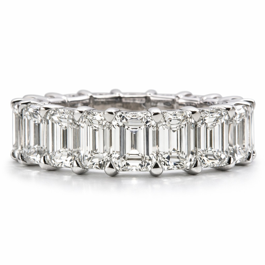 A brand-new, unused, certified natural diamond full eternity ring, showcasing an exceptional continuous arrangement of emerald-cut diamonds totalling an impressive 11.20ct, masterfully set in 18ct white gold. Each diamond is precisely matched for size and proportion, allowing the elongated step-cut facets to create a striking hall-of-mirrors effect around the entire band. The full eternity design offers seamless brilliance from every angle, delivering commanding finger coverage and a bold yet refined presence.