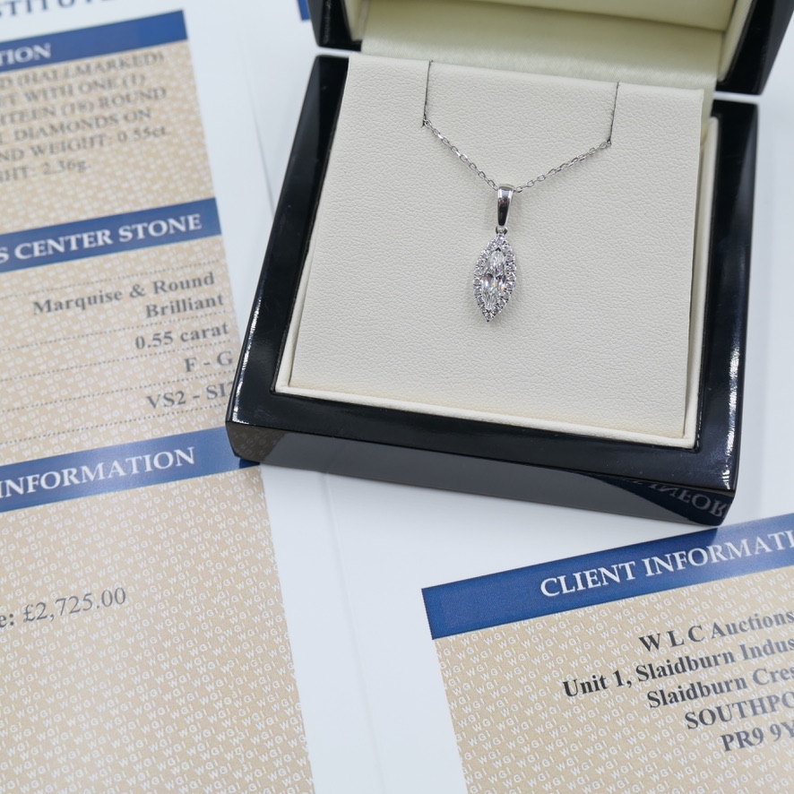 A brand-new, unused certified 18ct white gold natural diamond marquise-shaped cluster pendant, beautifully designed with a central marquise-cut diamond surrounded by a halo of round brilliant-cut diamonds totalling 0.55 carats. The diamond’s graceful, elongated shape and precise symmetry give the piece a refined and sophisticated appearance, perfectly enhanced by the bright lustre of white gold. With an F–G colour grade and VS2–SI2 clarity, the diamonds emit a clear, radiant brilliance that captures and reflects light with striking intensity, creating an elegant statement for both day and evening wear.