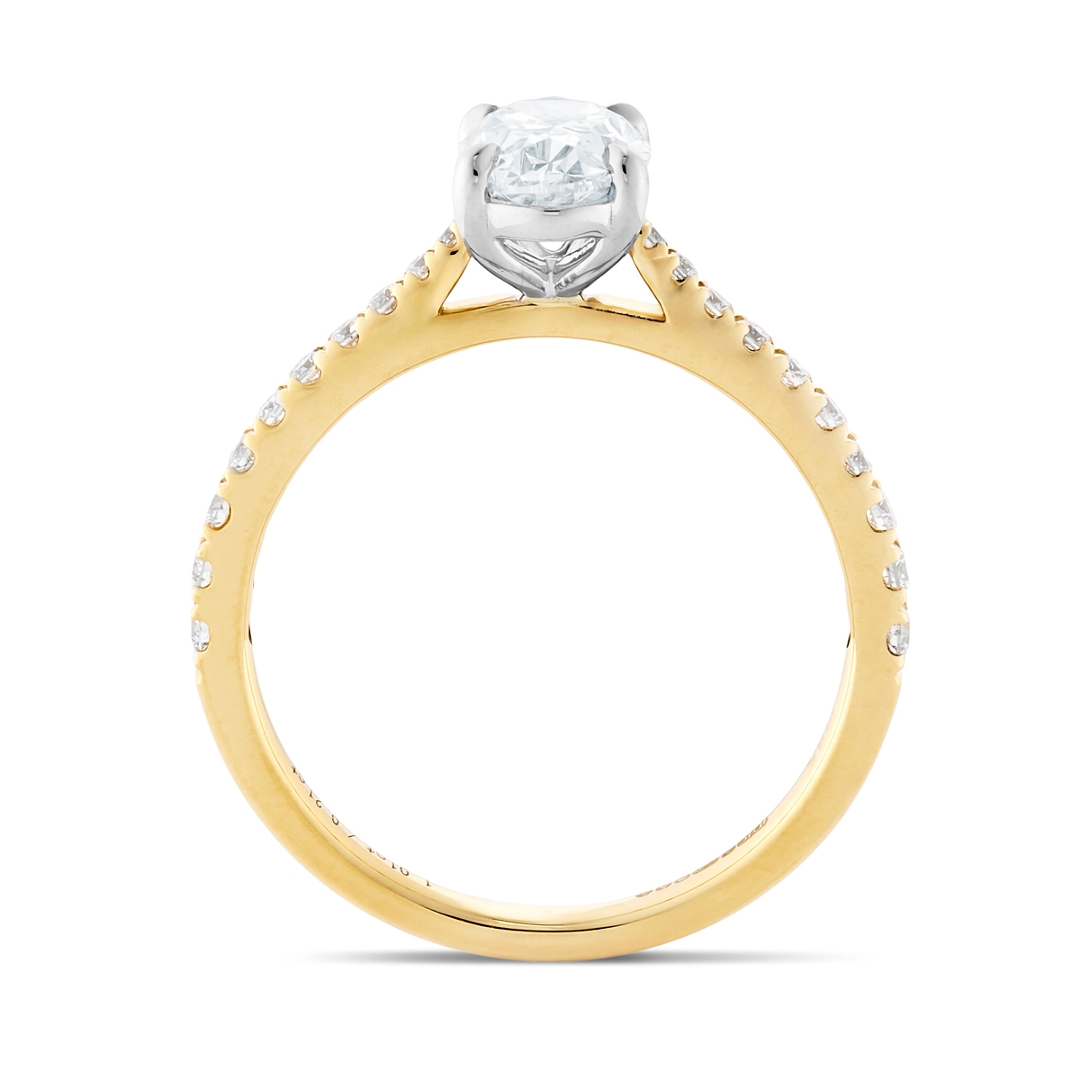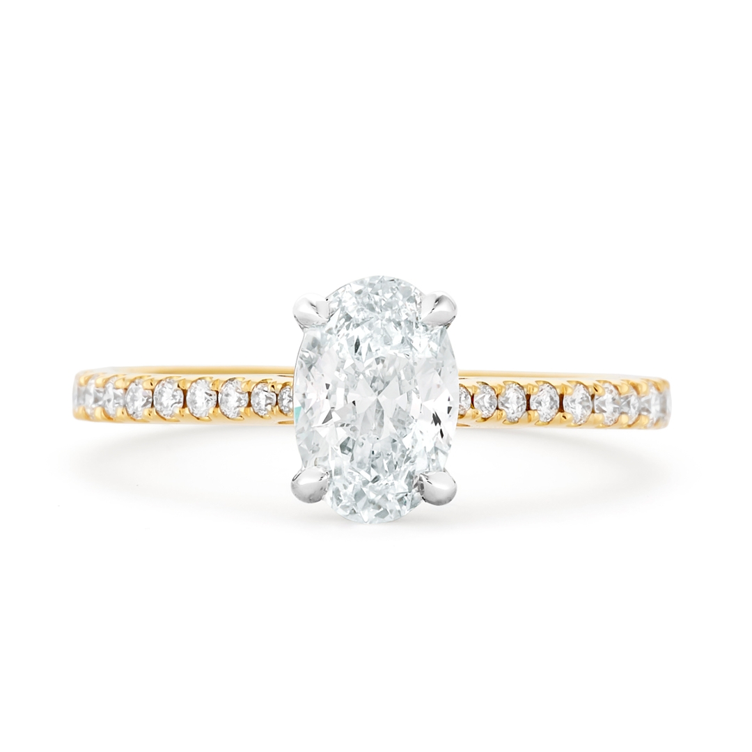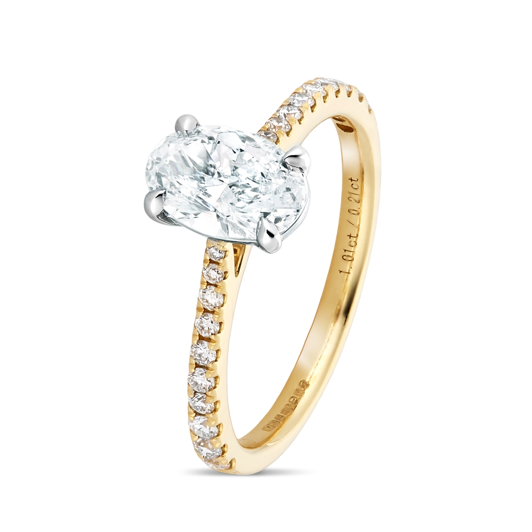 A brand-new, unused certified platinum and 18ct yellow gold solitaire engagement ring, crafted to emphasise the natural beauty of diamonds in a refined and elegant design. At its centre is an oval-cut diamond weighing 1.01 carats, graded SI2 clarity and G colour, with a graceful shape that reflects light beautifully. The shoulders are adorned with a cluster of brilliant-cut diamonds totalling 0.21 carats, graded between VS2 and SI1 clarity and F–G colour, enhancing the sparkle of the central stone and completing the ring with balance and sophistication. The contrast of platinum with yellow gold adds both strength and warmth, ensuring the ring carries timeless appeal.