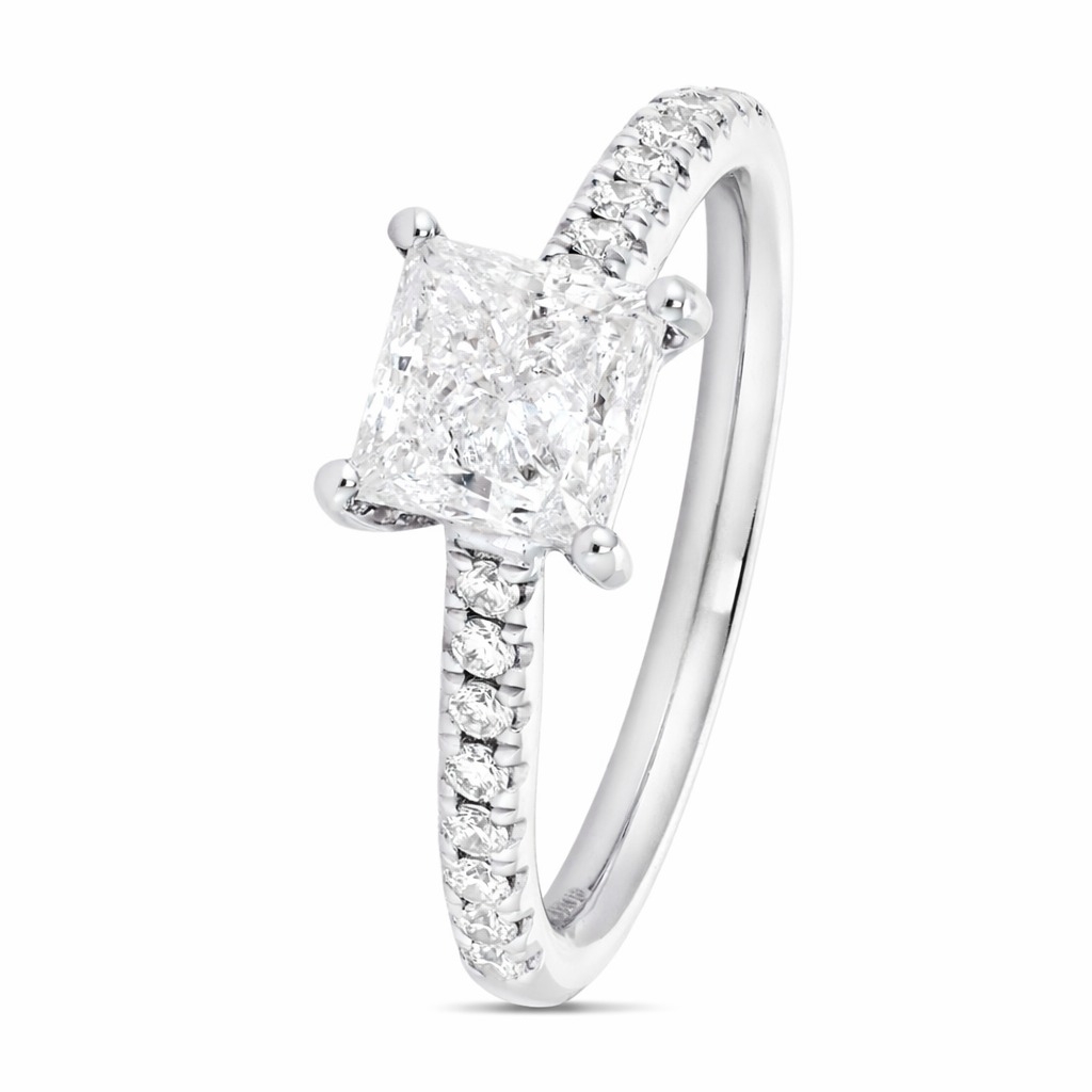 A brand-new, unused certified 18ct white gold engagement ring, this exquisite piece is a stunning blend of timeless elegance and enduring value. A dazzling 1.50ct princess-cut natural diamond is at its centre, radiating brilliance with SI2 clarity and G colour. Flawlessly complemented by a cluster of brilliant-cut diamonds along the shoulders, with a total weight of 0.19ct, these accent diamonds boast exceptional VS1-VS2 clarity and F-G colour. Together, they create a breathtaking display of light and sparkle.