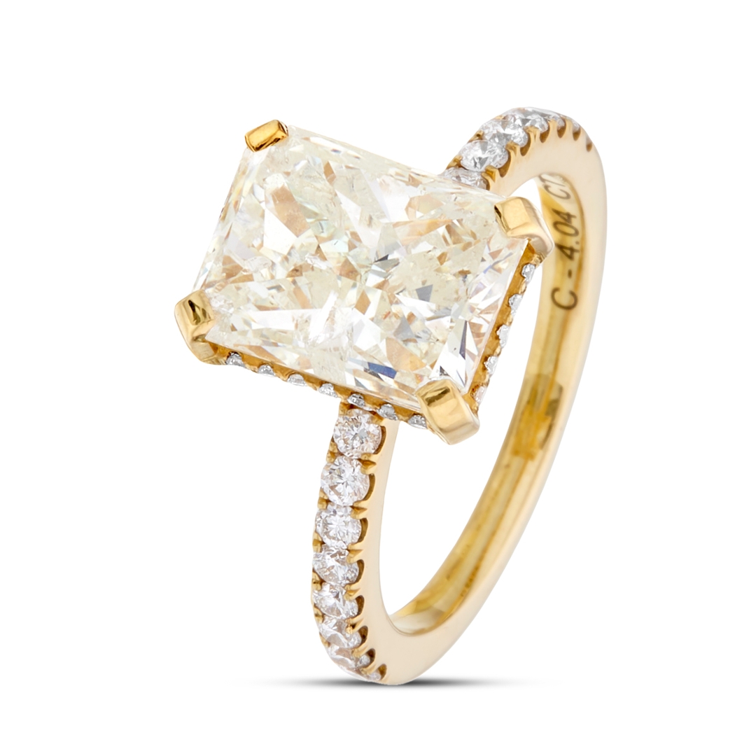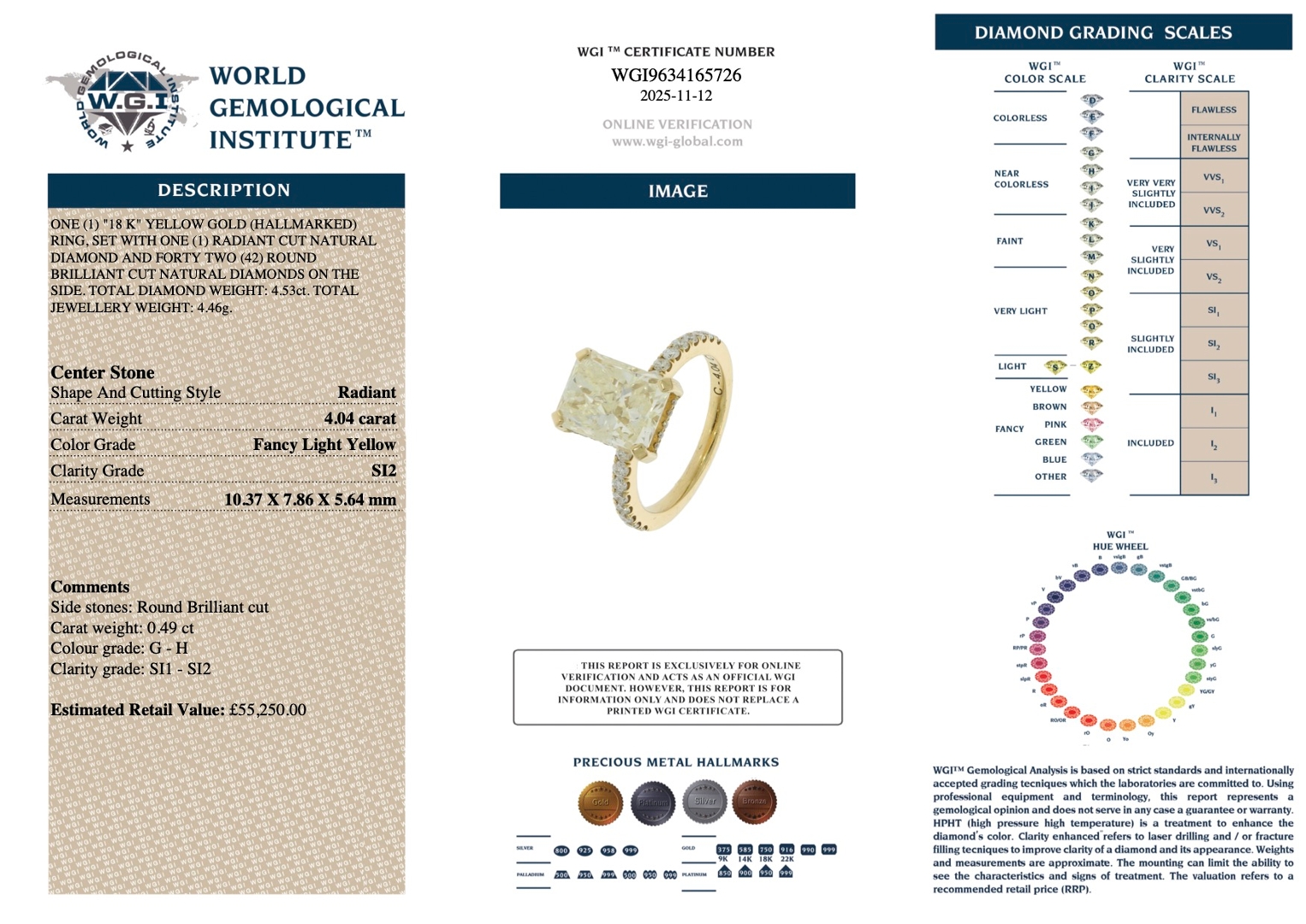A brand-new, unused certified natural diamond solitaire engagement ring that combines impressive scale, refined sparkle and a beautifully warm presence. At its centre sits a striking 4.04ct radiant-cut fancy light yellow diamond in SI2 clarity, offering a soft golden hue with lively flashes of brilliance that make the stone instantly captivating. The radiant cut enhances both colour and fire, giving the diamond a confident, elongated profile that stands out beautifully when worn. Accentuating the centre stone are natural brilliant-cut diamonds along the shoulders, totalling 0.49ct in G–H colour and SI1–SI2 clarity, adding crisp contrast and enhancing the overall luminosity. These natural diamonds contribute significantly to the ring’s desirability, reflecting the strong and enduring appreciation collectors hold for genuine, earth-formed stones admired for their rarity, authenticity and unmistakable charm.