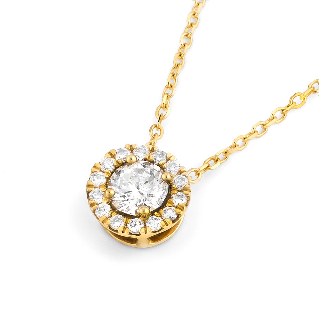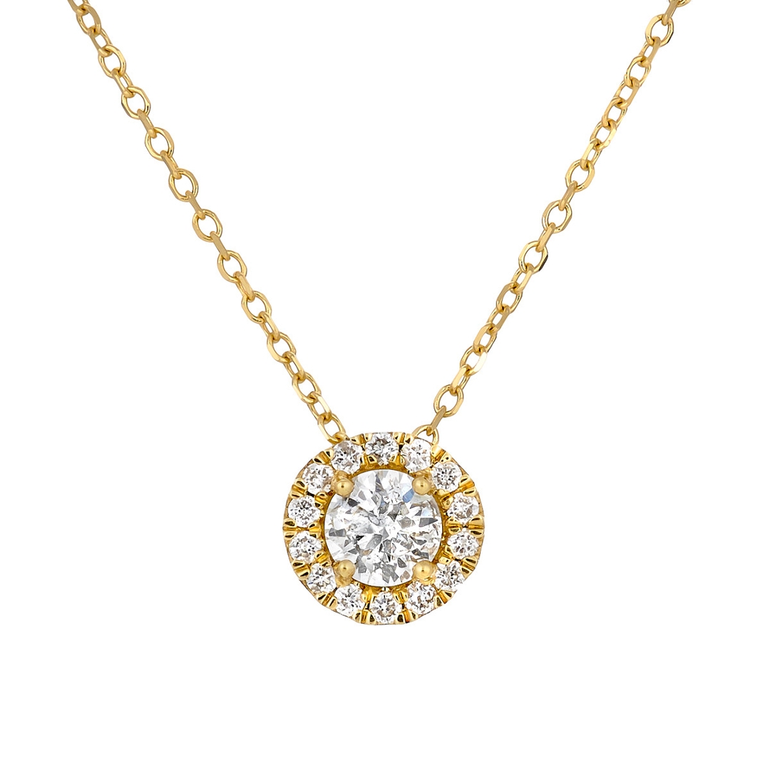 A brand-new, unused, certified natural diamond round-shaped cluster pendant, with one brilliant cut diamond to the centre & a cluster of brilliant cut diamonds in a halo setting, set in 18ct yellow gold.