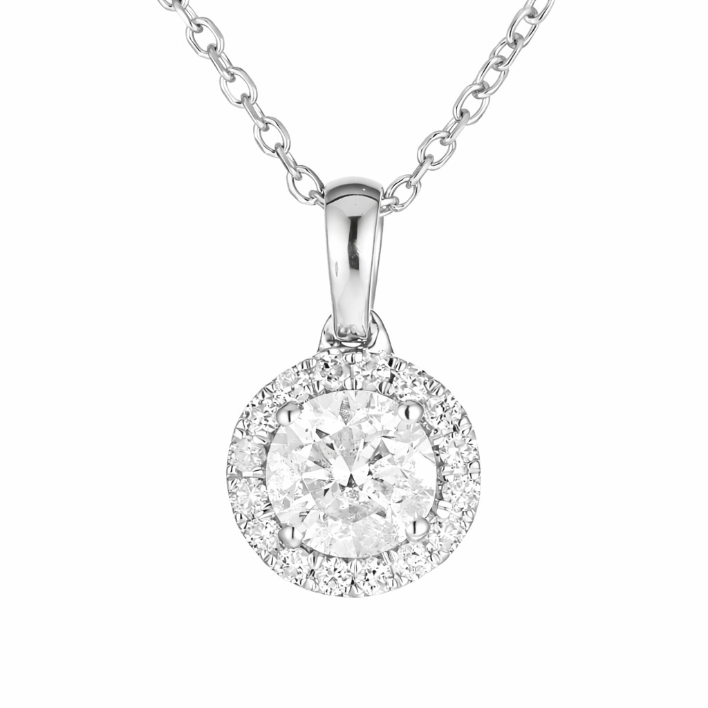 A brand-new, unused, certified natural diamond round-shaped pendant, set with one brilliant-cut diamond to the centre & a cluster of brilliant-cut diamonds in a halo design, set in 18ct white gold.