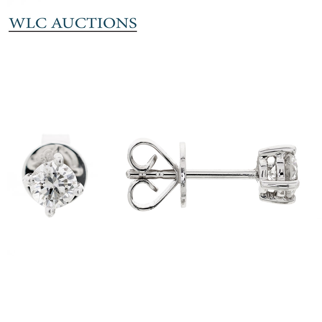 A brand-new, unused, certified pair of natural diamond solitaire earrings, this exquisite duo embodies timeless elegance and refined simplicity. Crafted in luxurious 18ct white gold, each earring showcases a stunning brilliant-cut natural diamond, together weighing 0.59 carats. The diamonds, graded H–I in colour and SI2 in clarity, display remarkable fire and scintillation, radiating a soft, captivating sparkle with every movement. Their classic round cut ensures maximum brilliance, making them a versatile and sophisticated choice for both everyday wear and formal occasions.