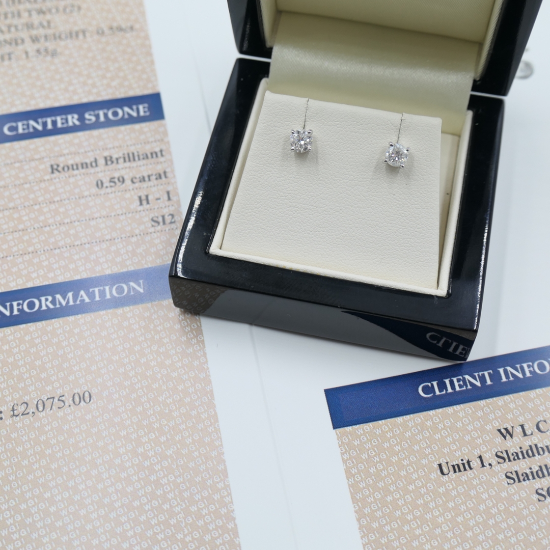 A brand-new, unused, certified pair of natural diamond solitaire earrings, this exquisite duo embodies timeless elegance and refined simplicity. Crafted in luxurious 18ct white gold, each earring showcases a stunning brilliant-cut natural diamond, together weighing 0.59 carats. The diamonds, graded H–I in colour and SI2 in clarity, display remarkable fire and scintillation, radiating a soft, captivating sparkle with every movement. Their classic round cut ensures maximum brilliance, making them a versatile and sophisticated choice for both everyday wear and formal occasions.