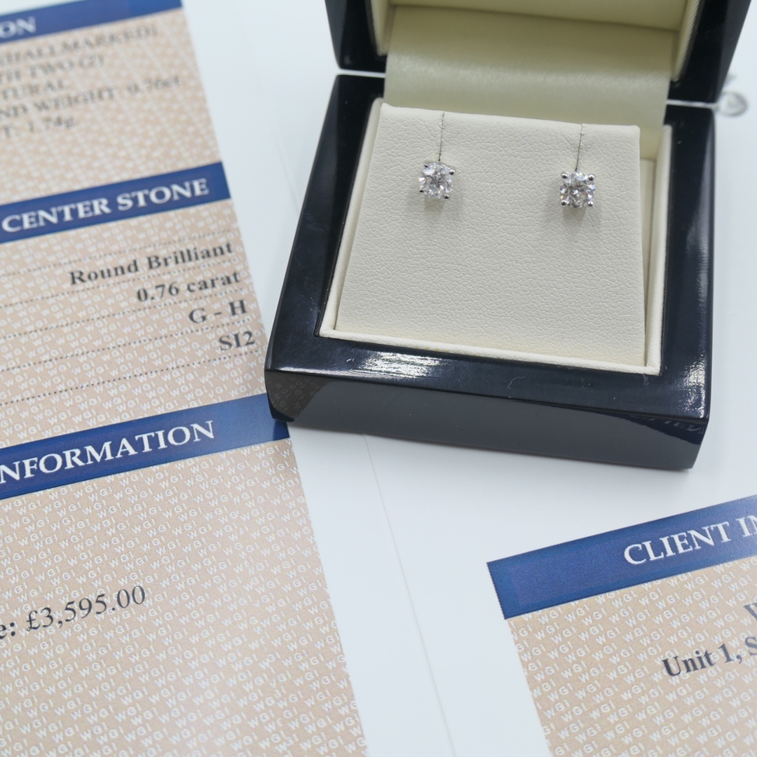 A brand-new, unused, certified pair of natural diamond solitaire earrings, this elegant set captures the timeless brilliance and sophistication of fine diamond jewellery. Each earring features a stunning, brilliant-cut natural diamond, weighing 0.76 carats. Graded G–H in colour and SI2 in clarity, the diamonds display exceptional fire and radiance, reflecting light beautifully from every facet. The brilliance and symmetry of the stones make them truly eye-catching, while their classic design ensures enduring elegance and versatility.