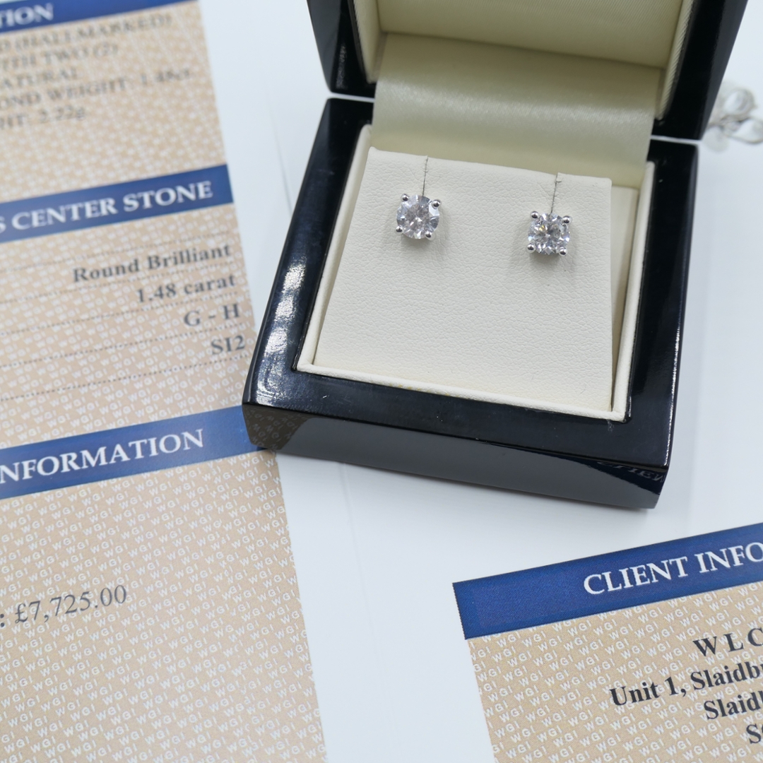 A brand new, unused certified pair of natural diamond solitaire earrings that radiate elegance, brilliance and enduring sophistication. Each earring showcases a stunning, brilliant-cut natural diamond, weighing 1.48ct, carefully selected for its exceptional fire and symmetry. The diamonds are graded G–H in colour and SI2 in clarity, offering a captivating balance of luminosity and natural depth. Expertly set in 18ct white gold, the cool, reflective metal enhances the diamonds’ pristine sparkle, creating a look of refined luxury and timeless appeal. Weighing 2.22 grams and professionally valued at £7,725, these earrings exemplify fine craftsmanship and understated opulence.