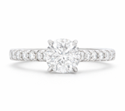 A brand-new, unused certified platinum engagement ring, expertly crafted to showcase the natural beauty of diamonds. This stunning piece features a brilliant-cut centre diamond, set to highlight its exceptional brilliance and fire. The centre stone is accompanied by a cluster of brilliant-cut diamonds on the shoulders, further enhancing the design's overall radiance.