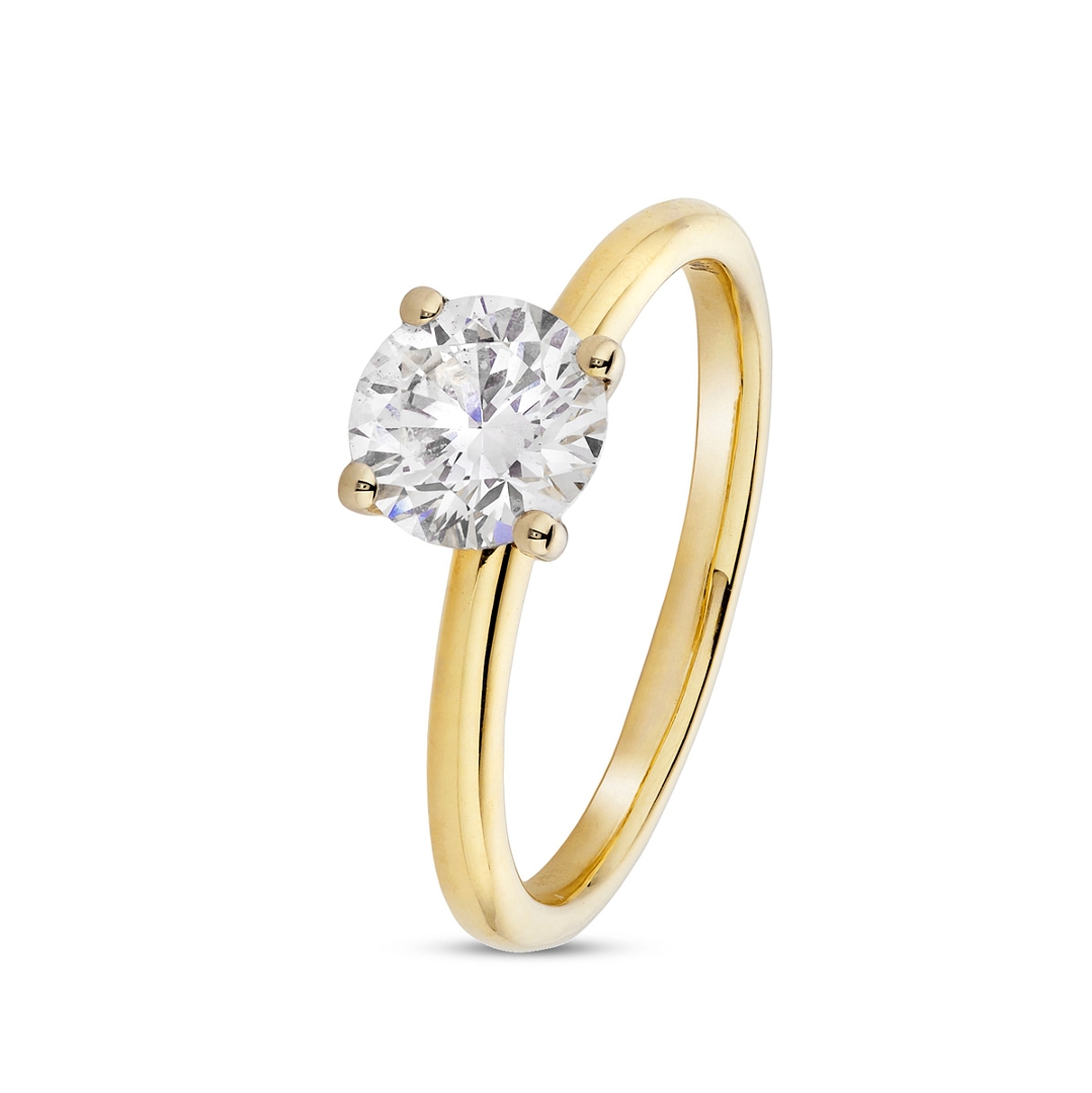 A brand-new, unused certified natural diamond solitaire engagement ring, featuring a single brilliant-cut diamond at its centre, set in 18ct yellow gold. This classic design is celebrated for its simplicity and elegance, allowing the diamond to remain the clear focal point, while the warm tone of the yellow gold band enhances its natural brilliance and creates a timeless, balanced aesthetic suited to both modern and traditional tastes.