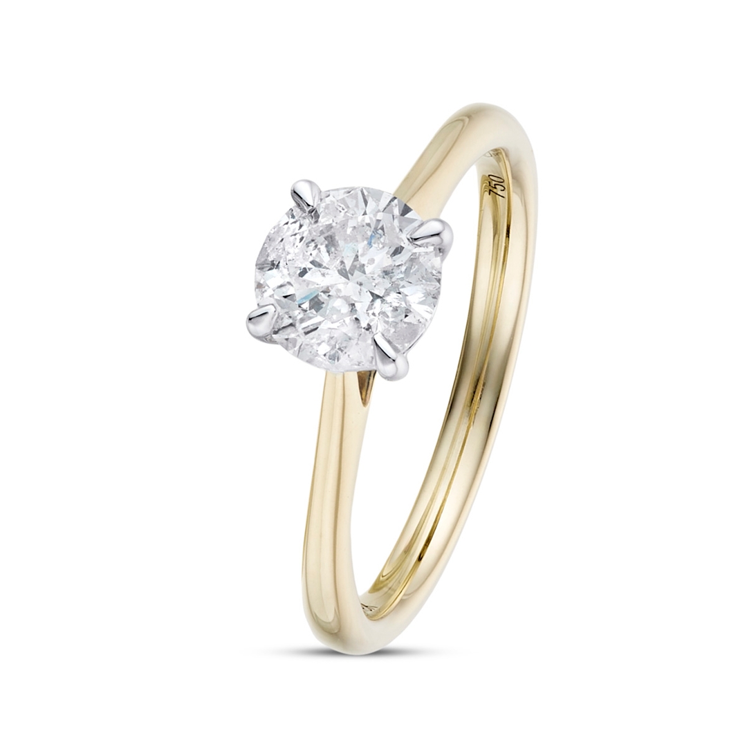 A brand-new, unused certified natural diamond solitaire engagement ring, set with a striking 1.21 carat brilliant cut diamond at its centre, mounted in an elegant combination of 18ct yellow and white gold. The contrasting two-tone setting enhances the diamond's presence, allowing the I colour stone to appear bright and lively, while the I1 clarity adds natural character to a beautifully proportioned cut. With a total weight of 3.31 grams, the ring feels both refined and reassuringly substantial on the hand.