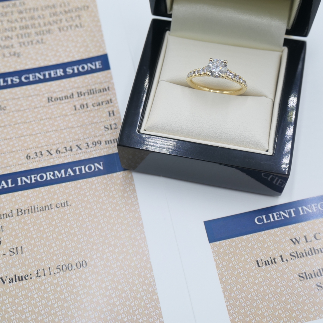 A brand-new, unused 18ct yellow gold engagement ring crafted to showcase both elegance and enduring value. At its centre lies a 1.01ct round brilliant cut natural diamond, graded H for colour and SI2 for clarity, offering a lively sparkle with warm undertones that harmonise beautifully against the rich gold setting. The shoulders are adorned with a cluster of fourteen additional round brilliant-cut diamonds, totalling 0.35ct, graded between F–G in colour and VS2–SI1 in clarity, adding a refined shimmer that enhances the central stone with graceful brilliance.