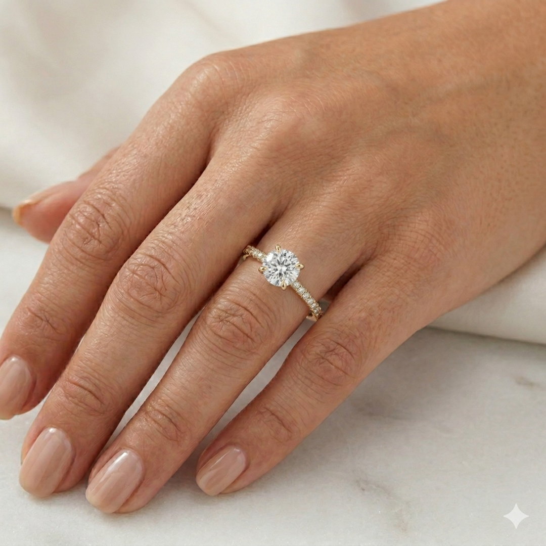A brand-new, unused certified natural diamond solitaire engagement ring that embodies timeless beauty, sophistication, and refined craftsmanship. At its centre, a magnificent 1.21-carat brilliant-cut natural diamond, graded G in colour and SI2 in clarity, radiates captivating brilliance and depth. The centre stone is perfectly complemented by a delicate cluster of brilliant-cut diamonds along the shoulders, totalling 0.15 carats, graded G–H in colour and SI1–SI2 in clarity. Together, they create a harmonious balance of sparkle and warmth, showcasing the unmatched authenticity and natural fire that only genuine diamonds possess.
