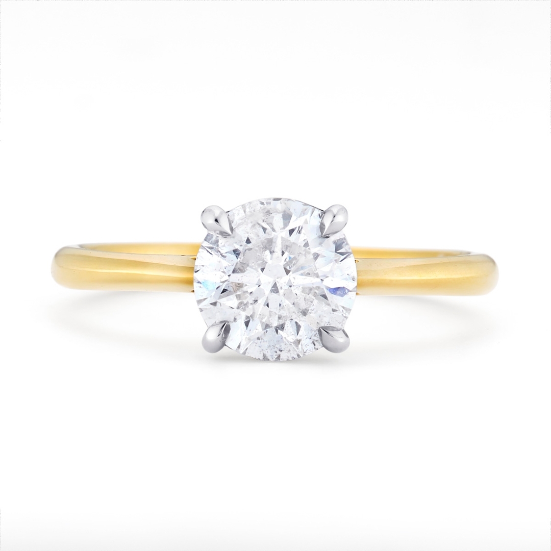 A brand-new, unused, certified natural diamond solitaire engagement ring, set with one brilliant cut diamond at the centre, set in platinum & 18ct yellow gold.