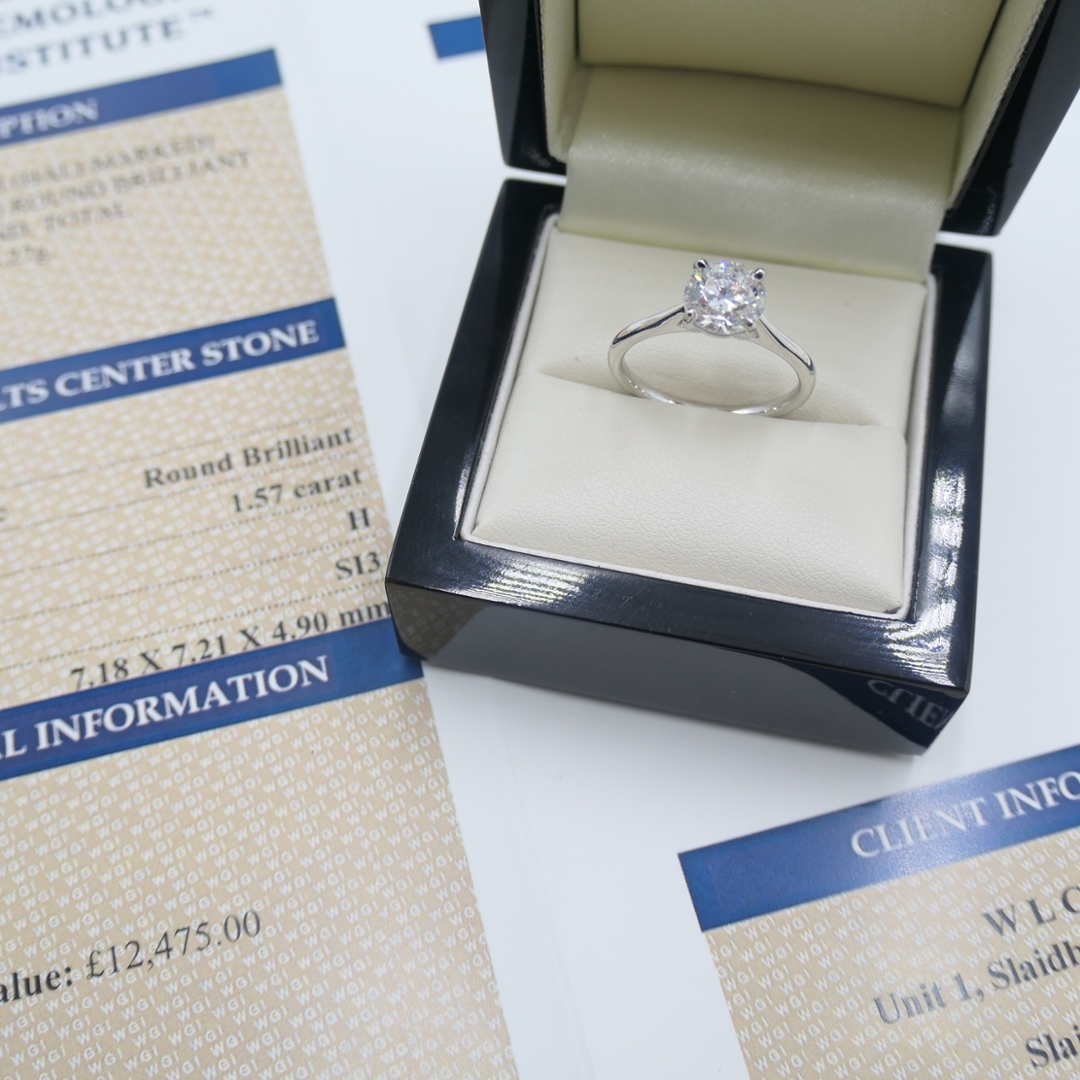 A brand-new, unused certified platinum solitaire engagement ring, designed to showcase the brilliance and rarity of a natural diamond. At its centre rests a 1.57-carat brilliant-cut diamond, graded SI3 clarity and H colour, offering a lively sparkle with a fine balance of size and presence. The platinum mount offers both durability and refinement, enhancing the stone's brightness while ensuring the design remains timeless and elegant. With a weight of 4.27 grams. This classic arrangement showcases the natural charm of the diamond, making it the centrepiece of the piece.