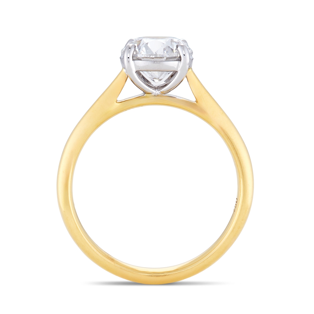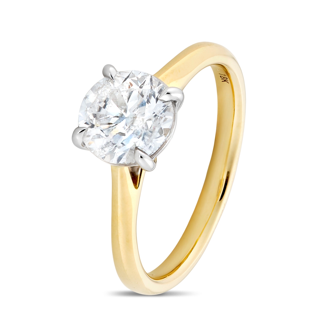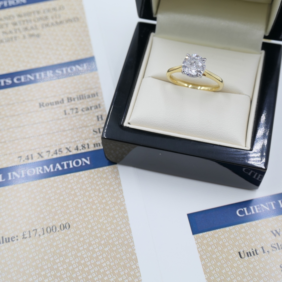 A brand-new, unused certified 18ct yellow and white gold solitaire engagement ring, created to celebrate the enduring beauty of a natural diamond. At its centre lies a brilliant-cut stone weighing 1.72 carats, graded SI2 clarity and H colour, which displays a lively sparkle and impressive presence. The white gold setting enhances the diamond’s brightness, while the yellow gold band adds warmth and character, resulting in a design that is both elegant and timeless. This harmonious combination of metals ensures the diamond remains the focal point while offering a distinctive style.